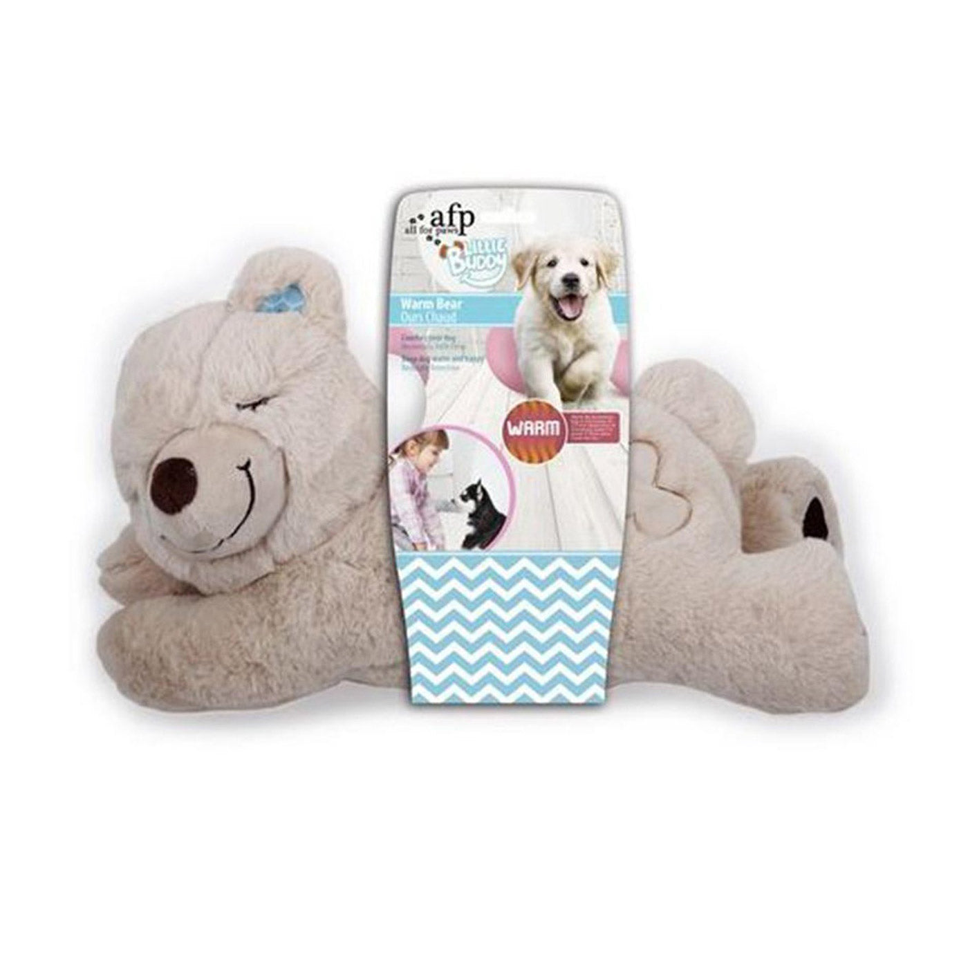 The Warm Bear includes a bag of buckwheat which you place in the microwave for 2-5 minutes (depending on the power of the microwave) to warm, and then place inside the bear. The plush bear comforts the puppy and helps reduce separation anxiety.