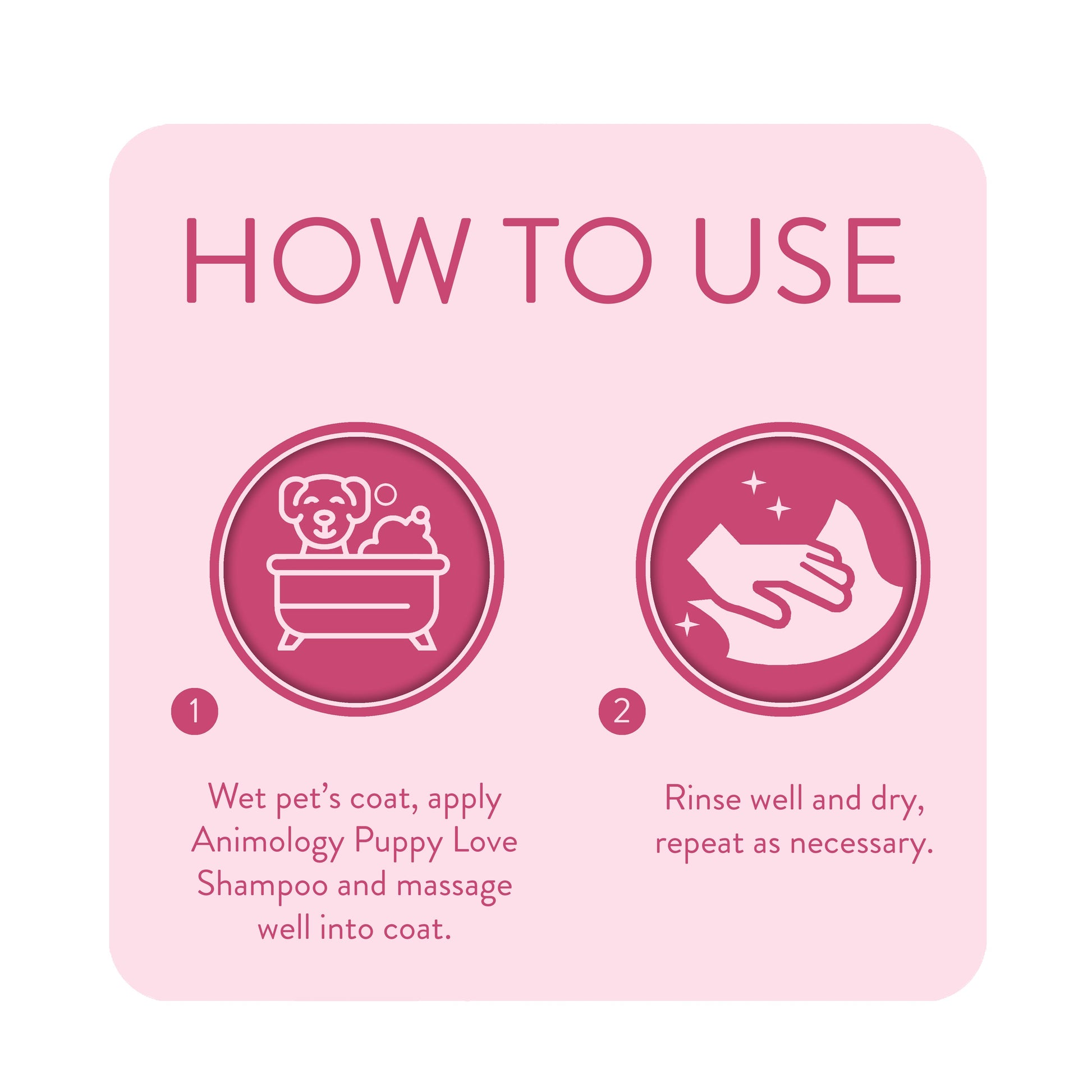 To use Puppy Love, wet your puppy with warm water and lather the Animology shampoo from the neck down. Gently massage the shampoo into the coat to create a lather, then rinse thoroughly with warm water. Afterward, dry your puppy with a towel.