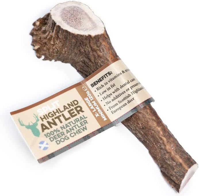 Antos Split Antler Extra Large 120g+ is a natural and long-lasting chew treat for dogs, derived from premium-quality antlers. These antlers are split to expose the marrow, creating a flavorful and durable chew that dogs love. They are typically rich in minerals like calcium and phosphorus, which contribute to dental health and strong bones.