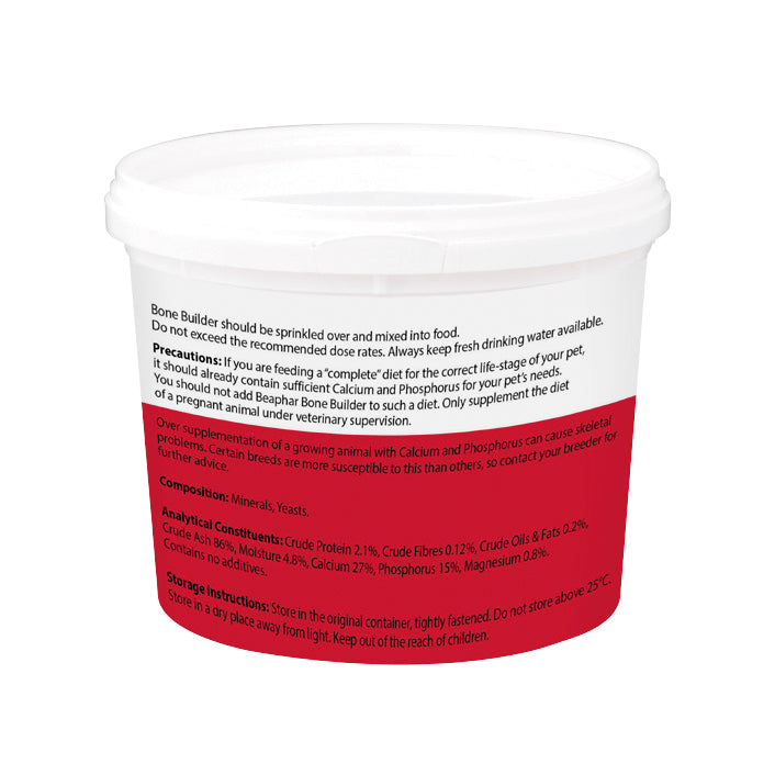 Beaphar Bone Builder is a highly palatable and convenient powdered nutritional supplement designed to support the development of strong and healthy bones and teeth in cats and dogs. Formulated with a balanced ratio of calcium and phosphorus, it provides the essential building blocks necessary for optimal bone health.