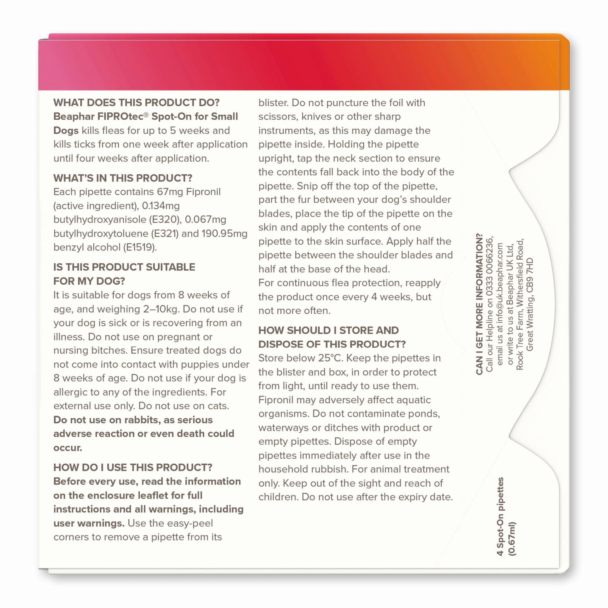 When applied regularly, Beaphar FIPROtec® Spot-On kills fleas for up to five weeks and ticks for up to four weeks. It is suitable for dogs from 8 weeks of age and weighing between 2-10kg.