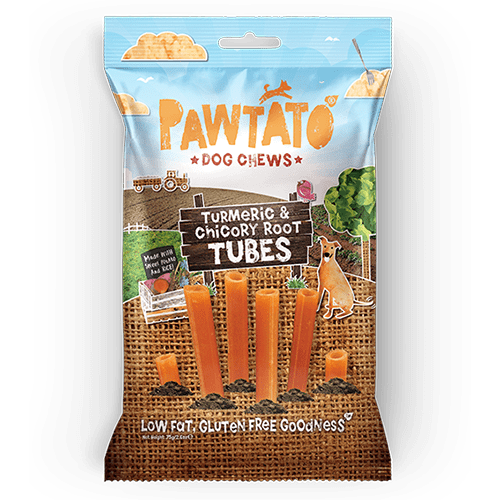 Benevo Pawtato Tubes with Turmeric & Chicory Root are low fat dog chews made from organically grown sweet potato, blended with gm-free rice and the popular super food Turmeric, known for it's anti-inflammatory properties, and Chicory Root.