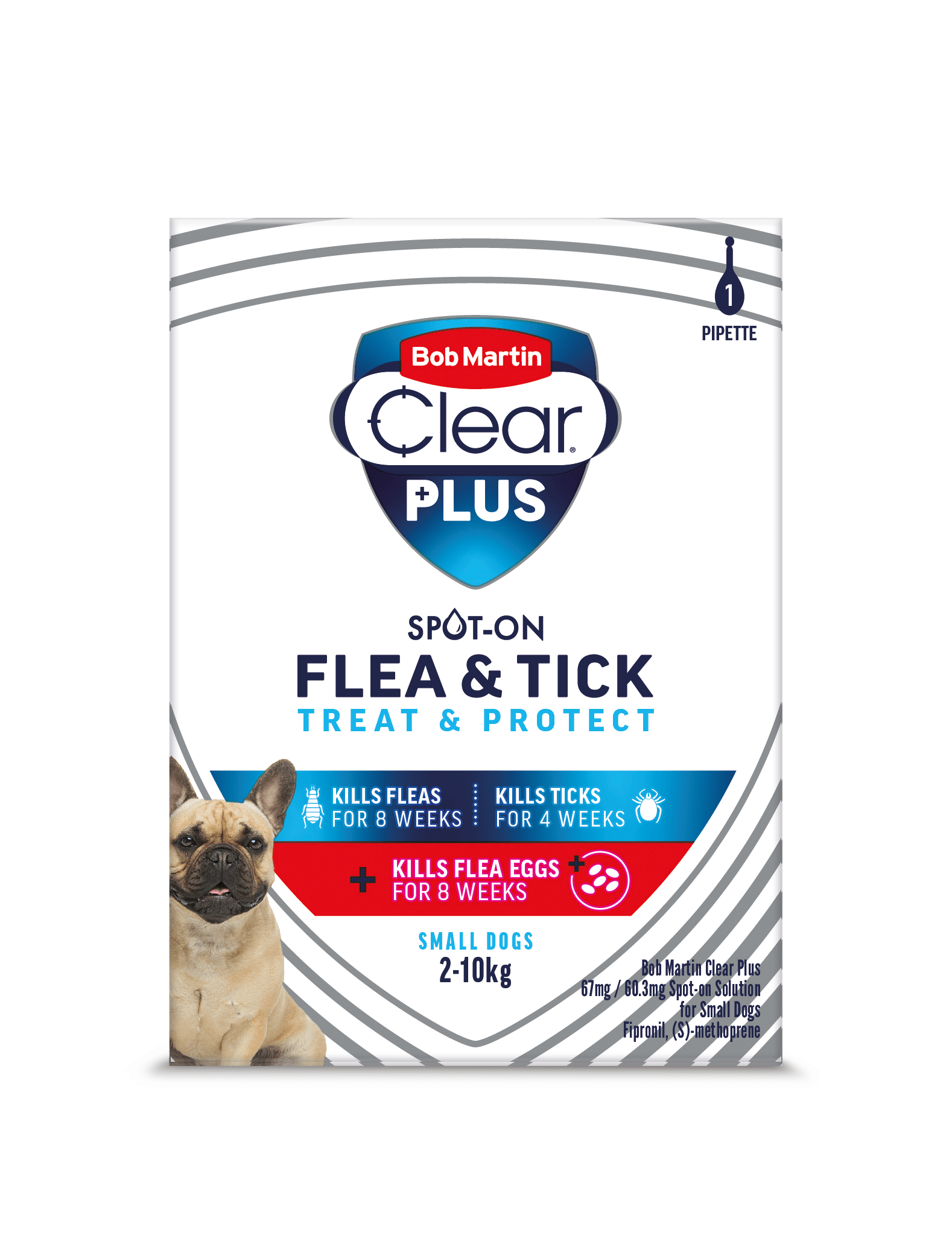 - Bob Martin Clear Plus Spot-On must be applied at 2 points – at the base of the back of the dog’s head and between the shoulder blades. If the dog is wearing a collar, remove it first so that it does not restrict application and don’t put the collar back on whilst the treatment is on the skin