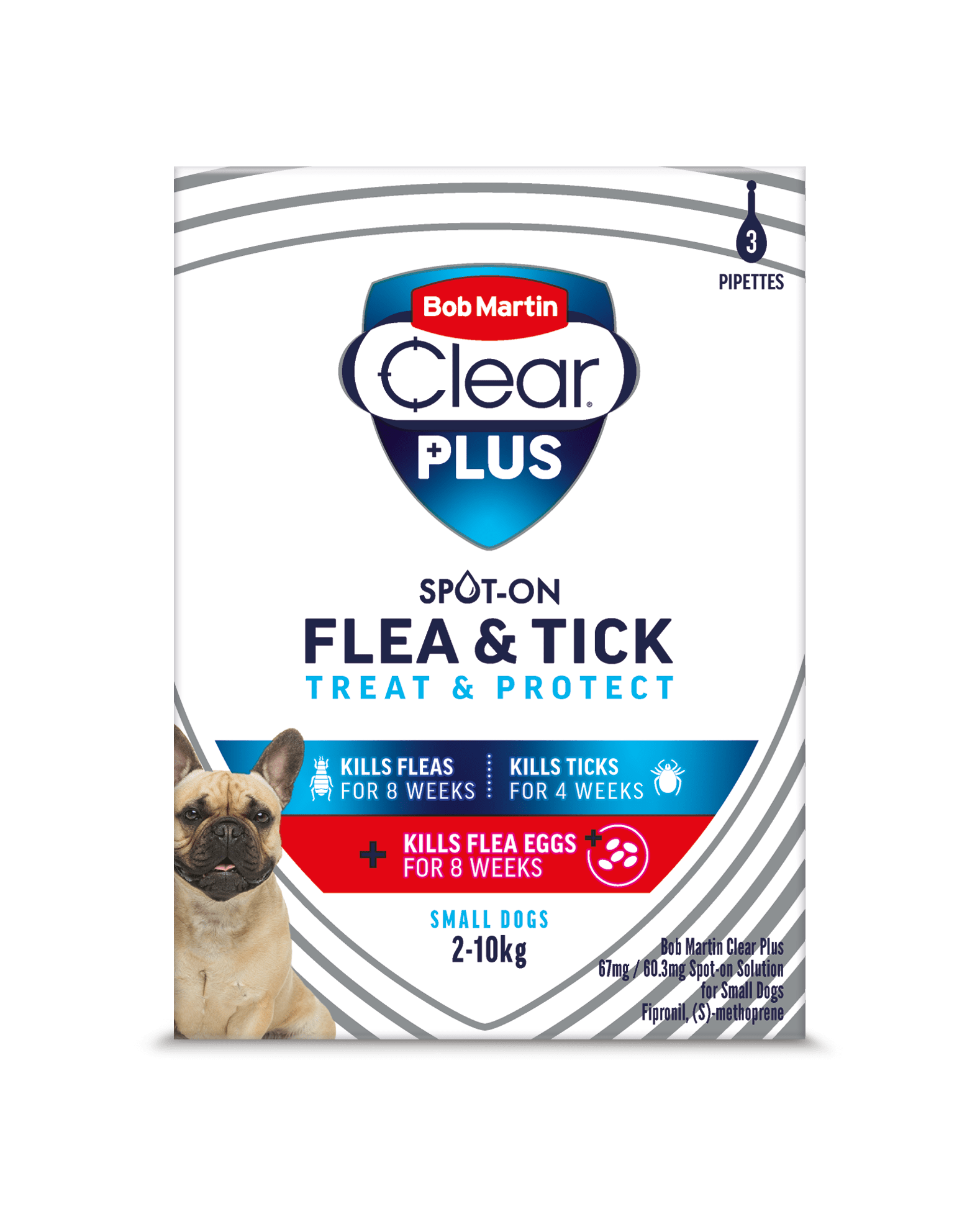 - Bob Martin Clear Plus Spot-On must be applied at 2 points – at the base of the back of the dog’s head and between the shoulder blades. If the dog is wearing a collar, remove it first so that it does not restrict application and don’t put the collar back on whilst the treatment is on the skin