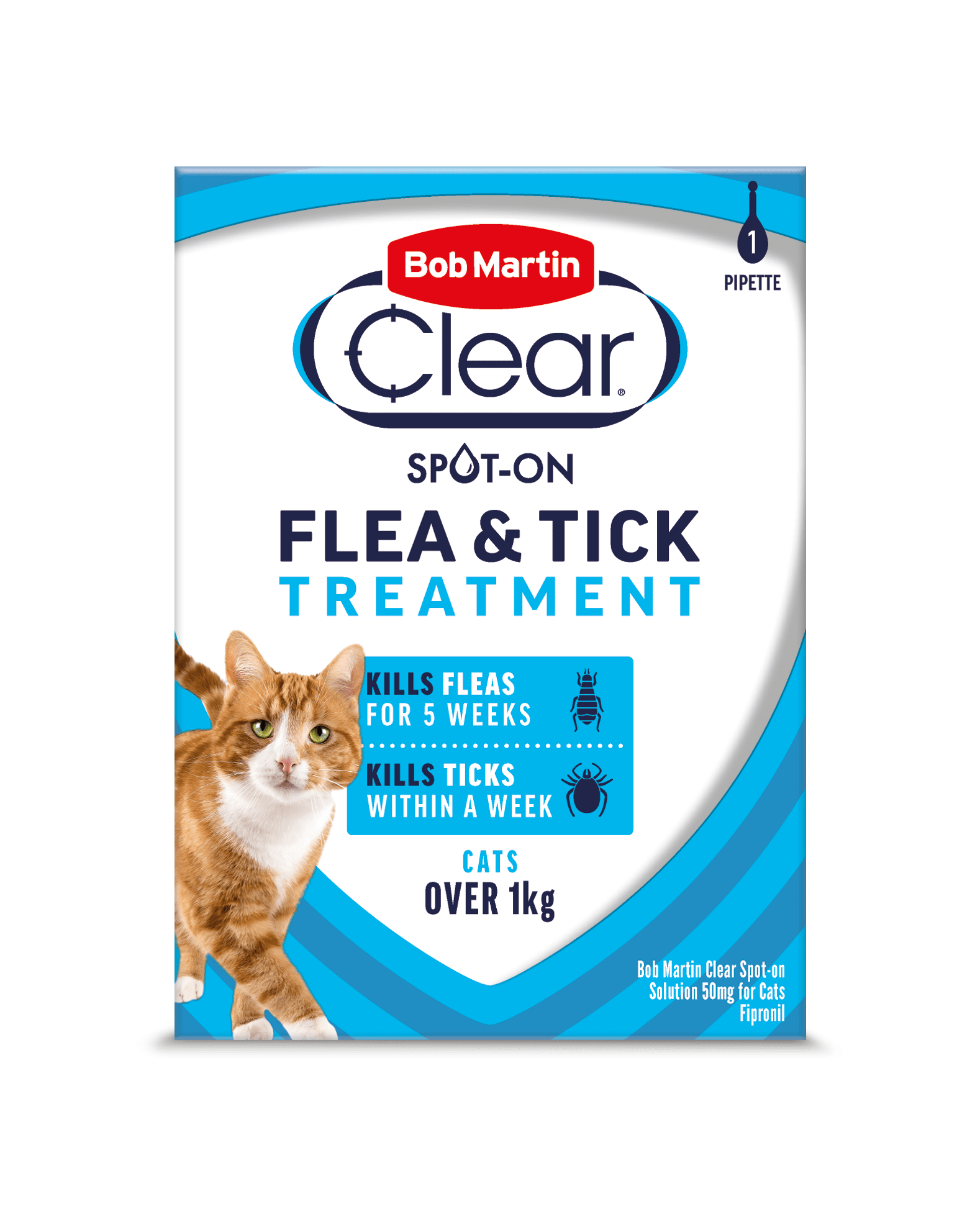 - Bob Martin Clear Spot-On must be applied at 2 points – at the base of the back of the pet’s head and between the shoulder blades. If the pet is wearing a collar, remove it first so that it does not restrict application and don’t put the collar back on whilst the treatment is on the skin.