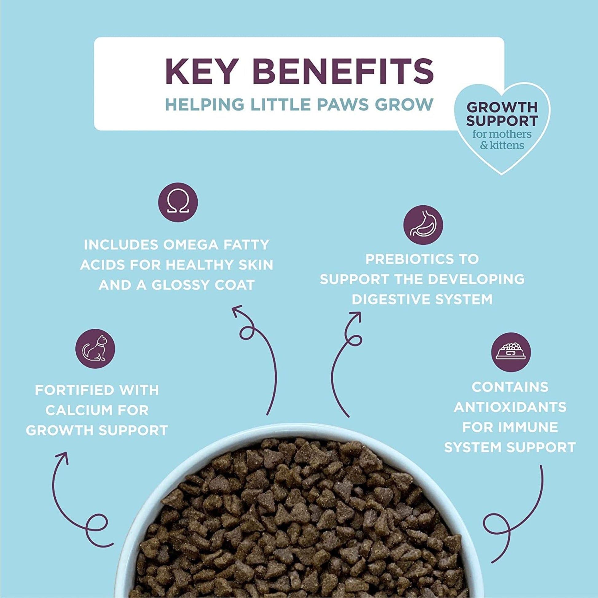 Our complete growth support recipe is packed with high-quality ingredients to provide optimal nutrition for kittens. It helps to support their healthy bone and muscle development, as well as their cognitive and immune system functions. We have also included essential fatty acids to promote healthy skin and a shiny coat.