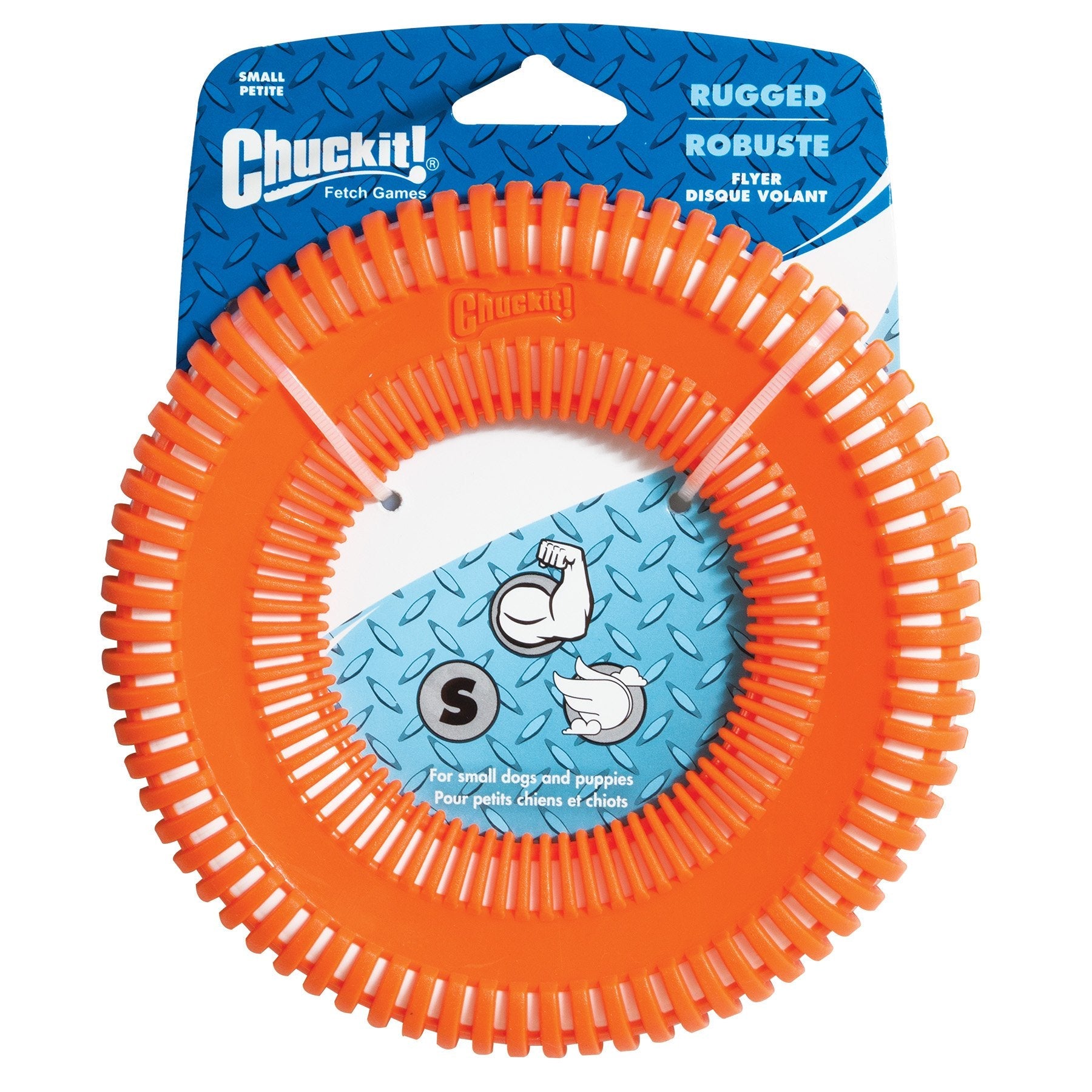 The Chuckit! Rugged Flyer is designed to withstand tough dogs and rough play. The rigid polypropylene core provides durability and strength, while the over-moulded TPR ridges allow dog's teeth to grip the toy without puncturing it. The Rugged Flyer's ergonomic shape provides easy pickup and retrieval for dogs. The Rugged Flyer also floats, making it great for both land and water play! The bright colour provides high-visibility for dogs. Ships in assorted colours blue or orange.