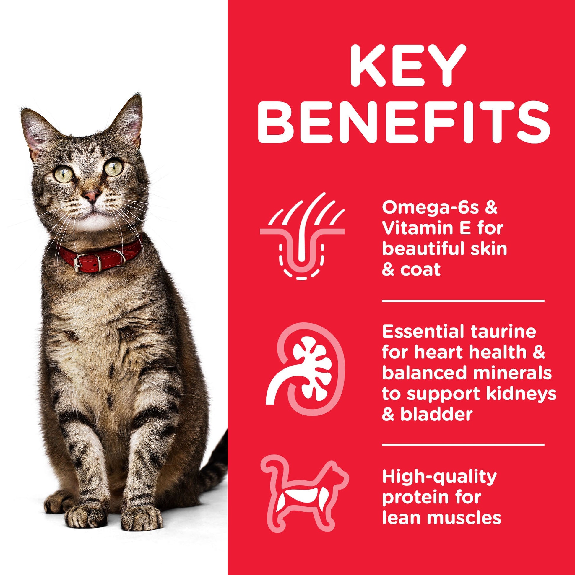 HILL'S SCIENCE PLAN Adult dry cat food is specially formulated to fuel the energy needs of cats during the prime of their life. Made with high quality, easy-to-digest ingredients. Essential taurine for heart health & balanced minerals to support kidneys & bladder. High-quality protein for lean muscles. Vitamin E, Omega-3s & -6s for beautiful skin & fur
