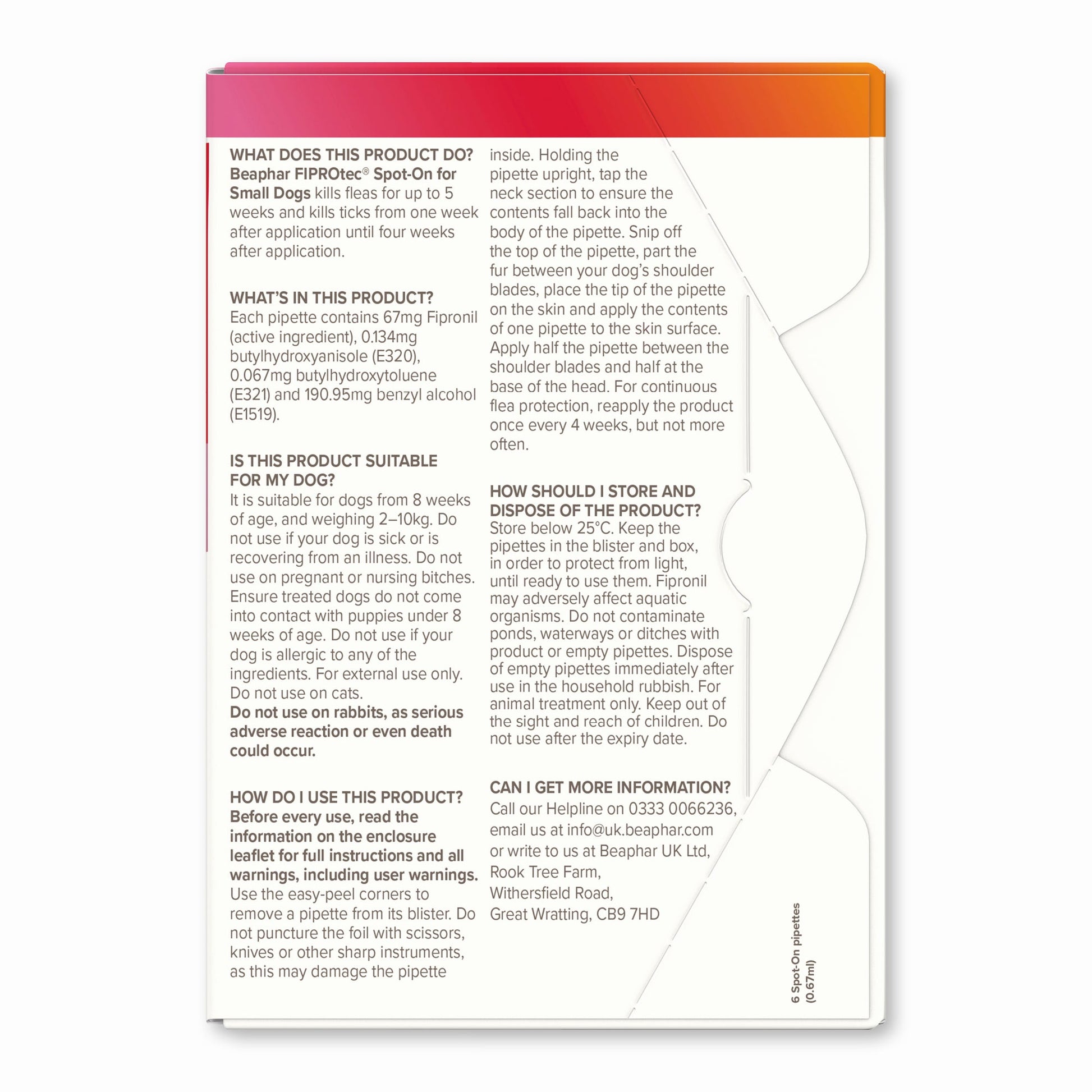 Beaphar FIPROtec® Spot-On for Small Dogs is a trusted veterinary medication, available without a prescription, formulated with fipronil to effectively manage fleas and ticks. This solution is designed to eliminate fleas for up to five weeks and ticks for up to four weeks, providing reliable protection. It is suitable for dogs aged 8 weeks and older, weighing between 2–10kg.