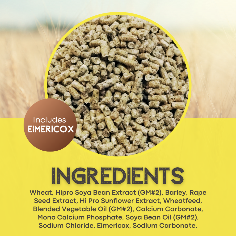 This complete feed is specifically designed for chicks from hatching up to 5/6 weeks of age. It provides essential nutrition to support the early stages of growth and development in young birds. Notably, this feed contains Eimericox, a natural herbal alternative to coccidiostats, which helps promote the overall health and well-being of the chicks.