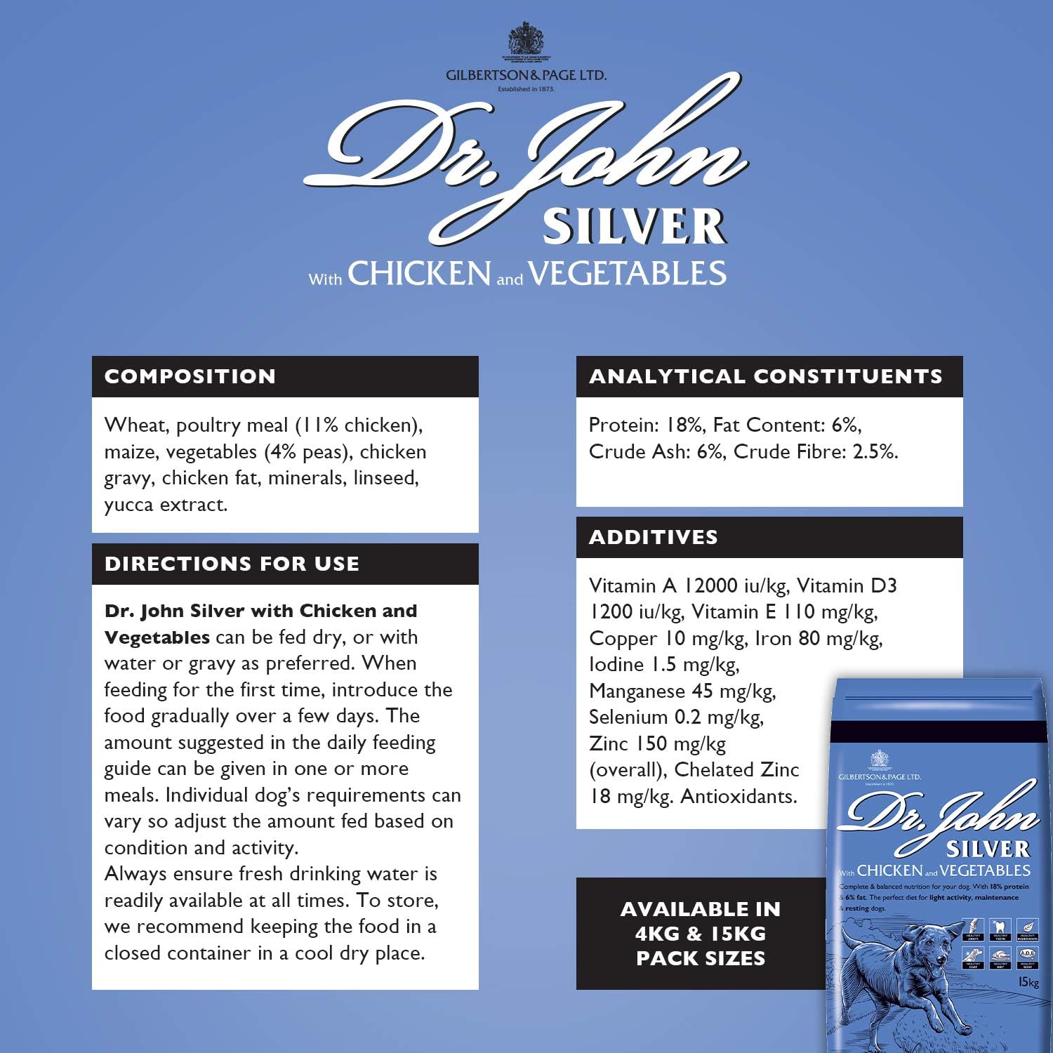 Dr John Silver with Chicken is a complete dog food specifically formulated for less active adult dogs and seniors. It is designed to provide a balanced and nutritious diet with low levels of protein, fat, and energy to meet the needs of dogs with lower activity levels.