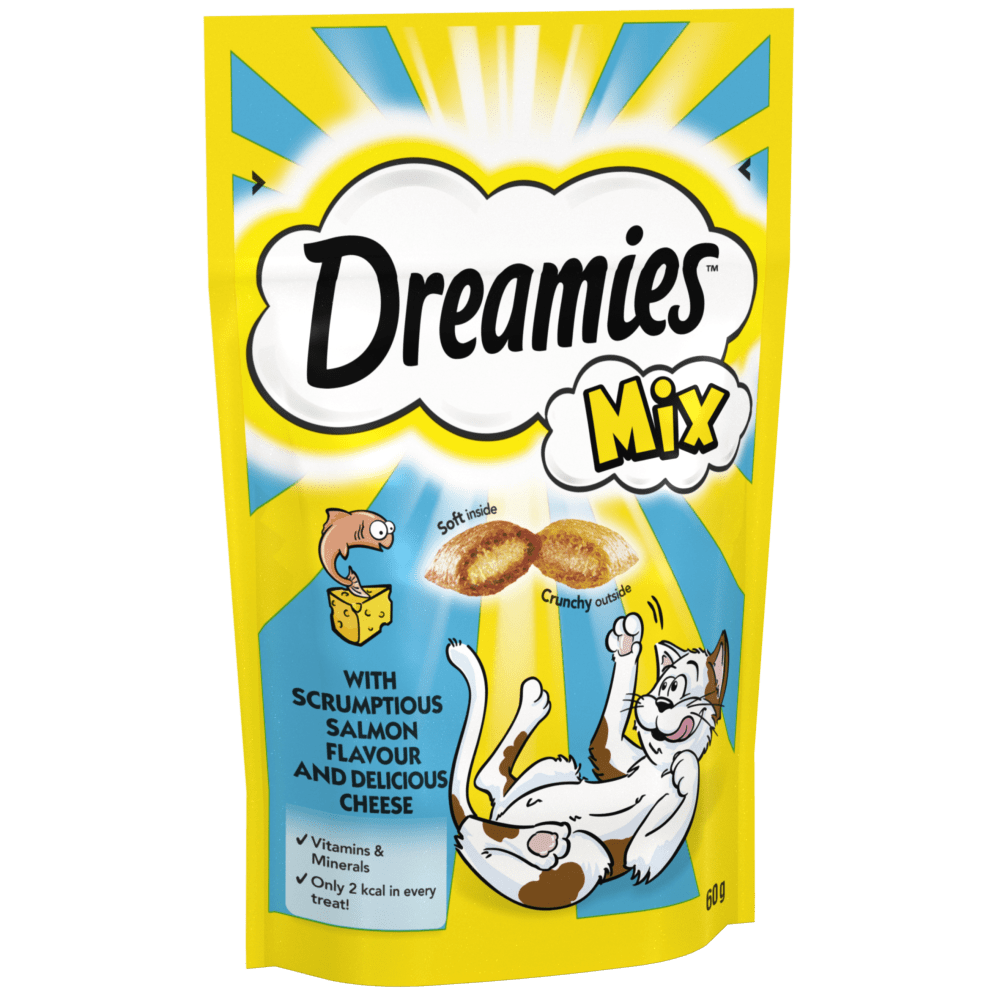 The new DREAMIES™ Mix cat treats are here to take your cat's taste experience to a whole new level of excitement! With two great flavours, Scrumptious Salmon and Delicious Cheese packed into one bag, your feline friend is in for a delightful surprise.