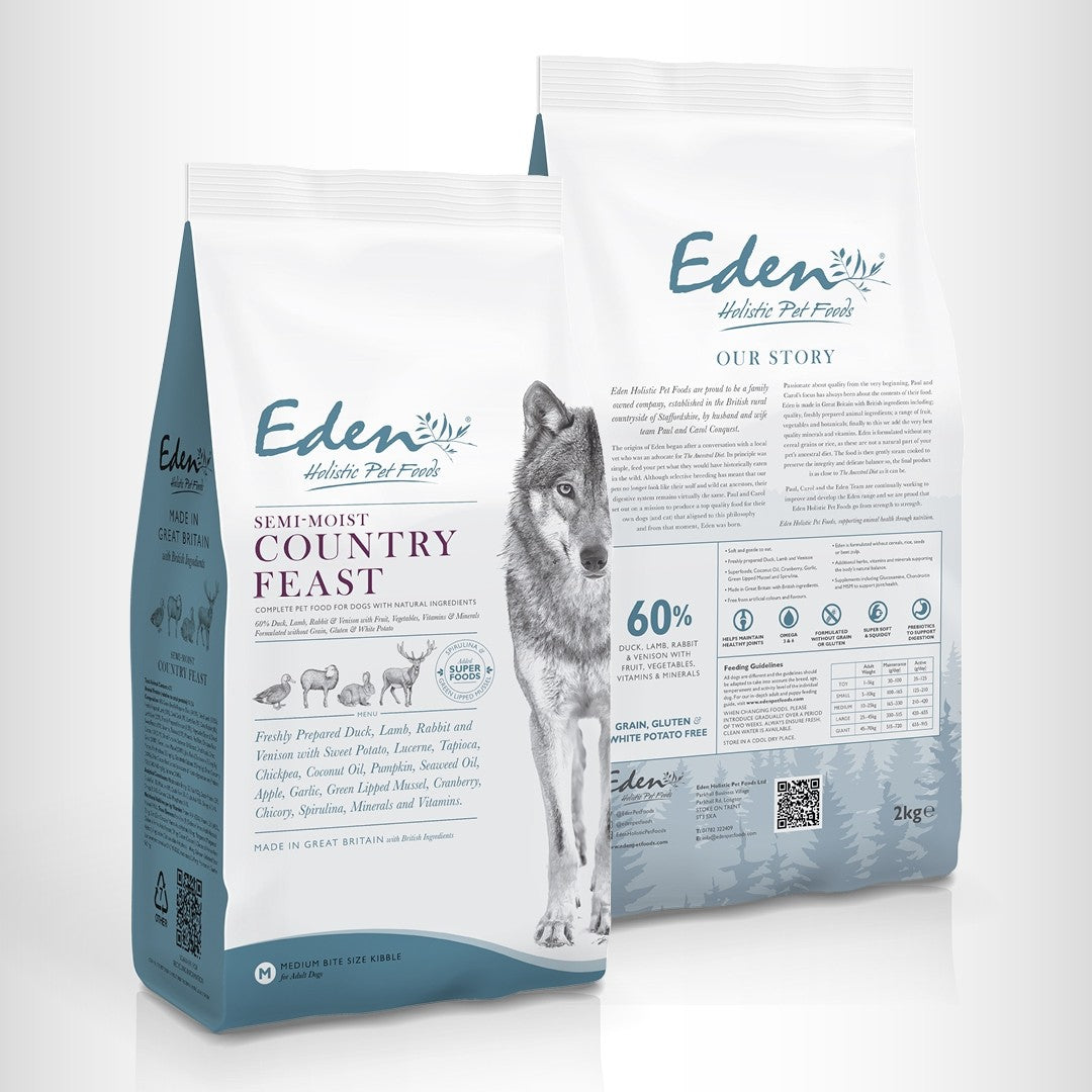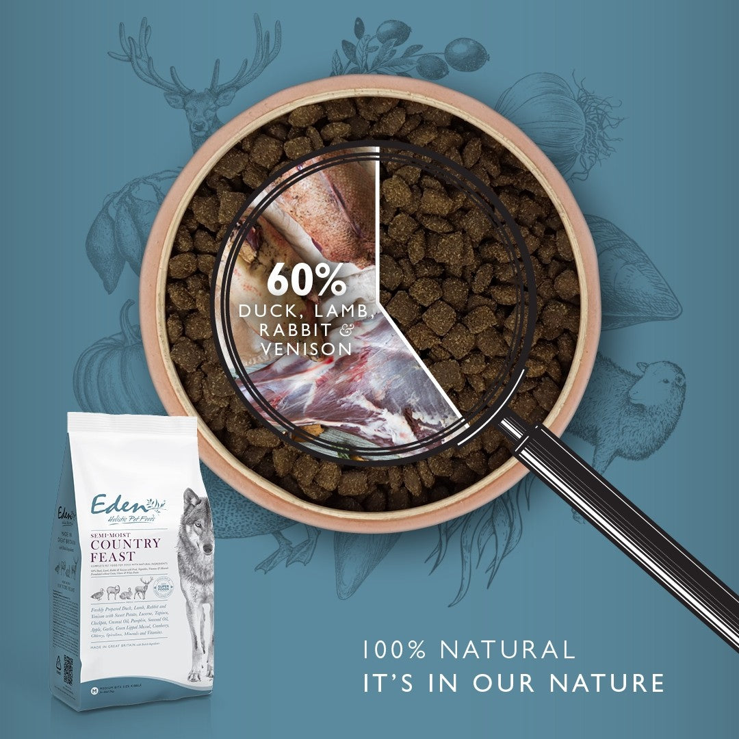 Eden Semi-Moist Country Feast uses the finest ingredients, using freshly prepared Duck, Lamb, Rabbit and Venison, with super foods: Spirulina, Green Lipped Mussel, Coconut Oil, Seaweed Oil, Cranberry, and additional herbs, vitamins and minerals supporting the body’s natural balance, a unique combination of ingredients.