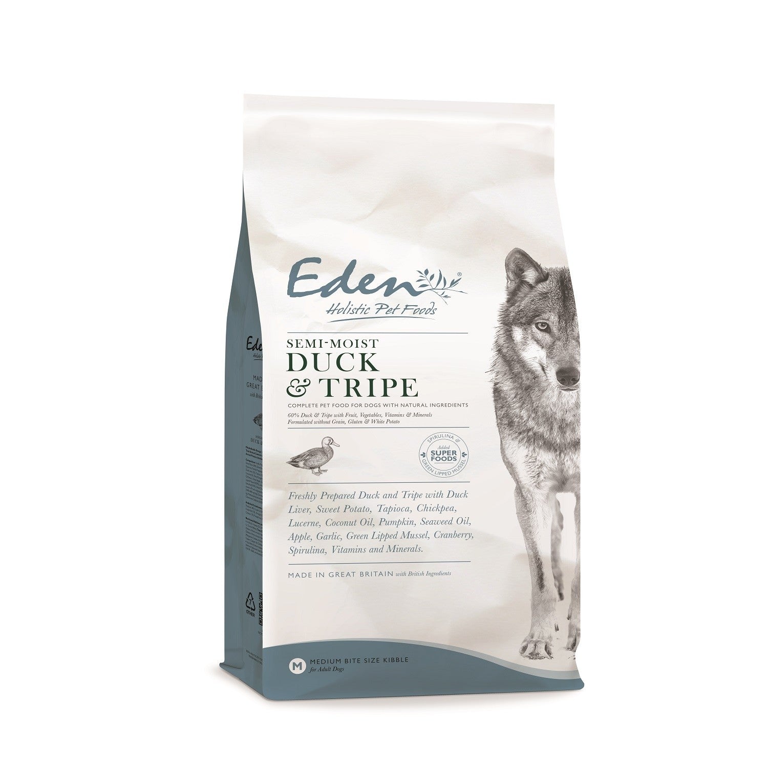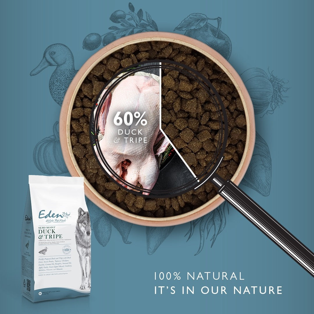 Eden Semi-Moist Duck and Tripe uses the finest ingredients, using freshly prepared Duck with Super foods: Spirulina, Green Lipped Mussel, Coconut Oil, Cranberry and Garlic, a unique combination of ingredients.