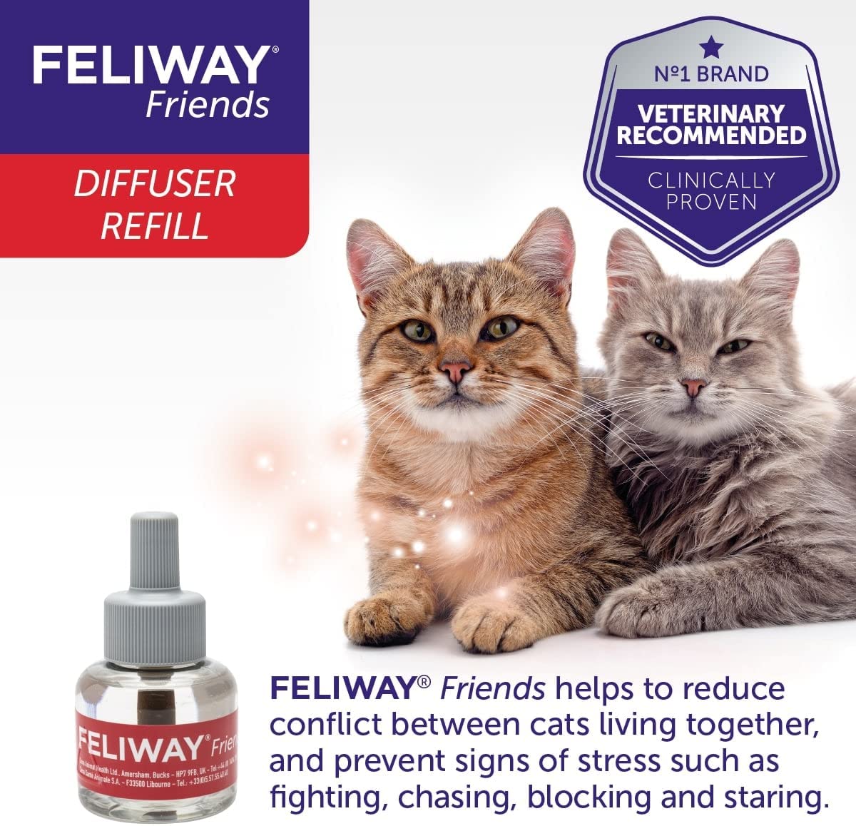 FELIWAY Friends is a product designed to help reduce tension and conflict between multiple cats living in the same household. It contains a synthetic copy of the cat appeasing pheromone, which helps to promote a sense of harmony and companionship among cats.