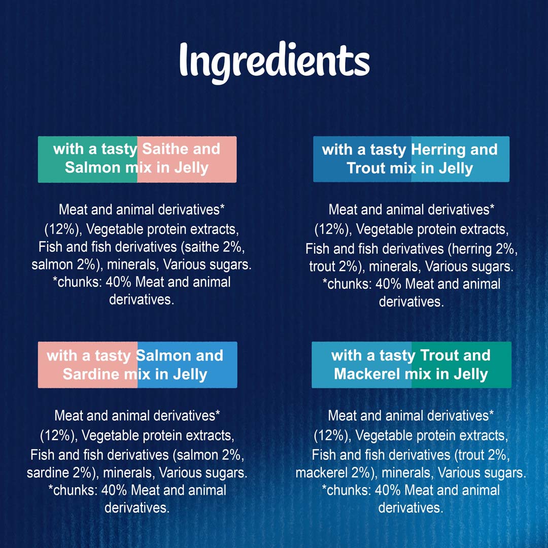 Indulge your cat's love for fish with the delectable FELIX As Good As It Looks Doubly Delicious Adult Cat Fish Selection in Jelly! This specially curated selection offers a variety of enticing flavors, including salmon and sardine, trout and mackerel, saithe and salmon, and herring and trout. Your cat will be delighted by the abundance of fishy options!