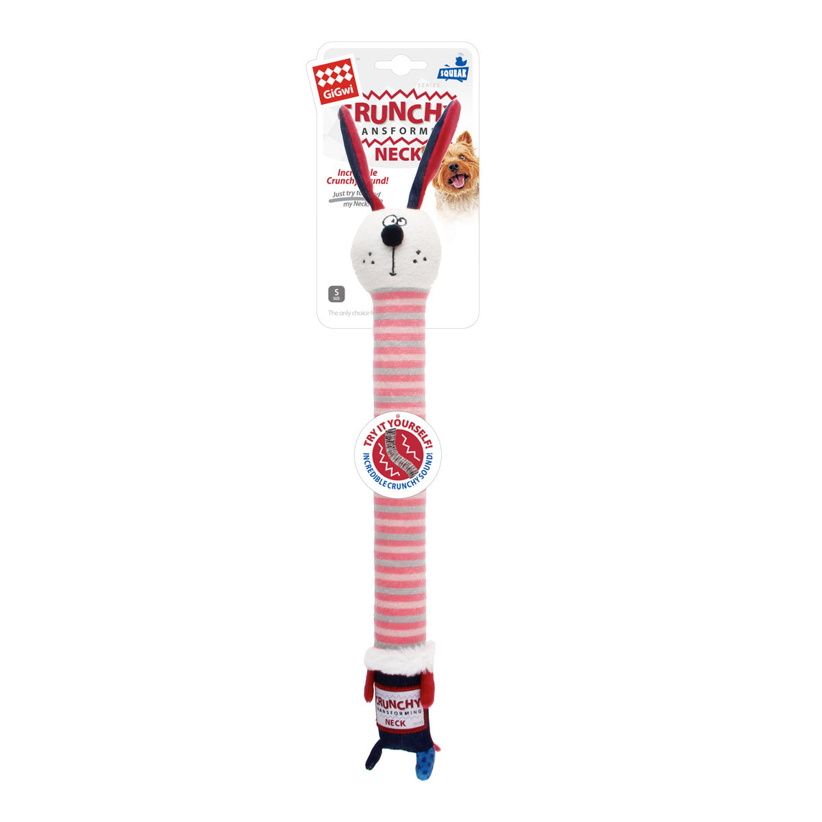 The Crunchy Transforming Neck Series has been specifically designed with a fun crunchy mechanism that can bend, rotate and be chomped on without losing its shape! It is protected by a special foam material underneath the outer plush, which hides a squeaker, adding to the fun. Dogs love the sounds this toy makes, bringing hours of entertainment by honing in on their natural hunting instincts. Rotate or break it in any way possible; our ultra-bendy toys will take on any shape they can.
