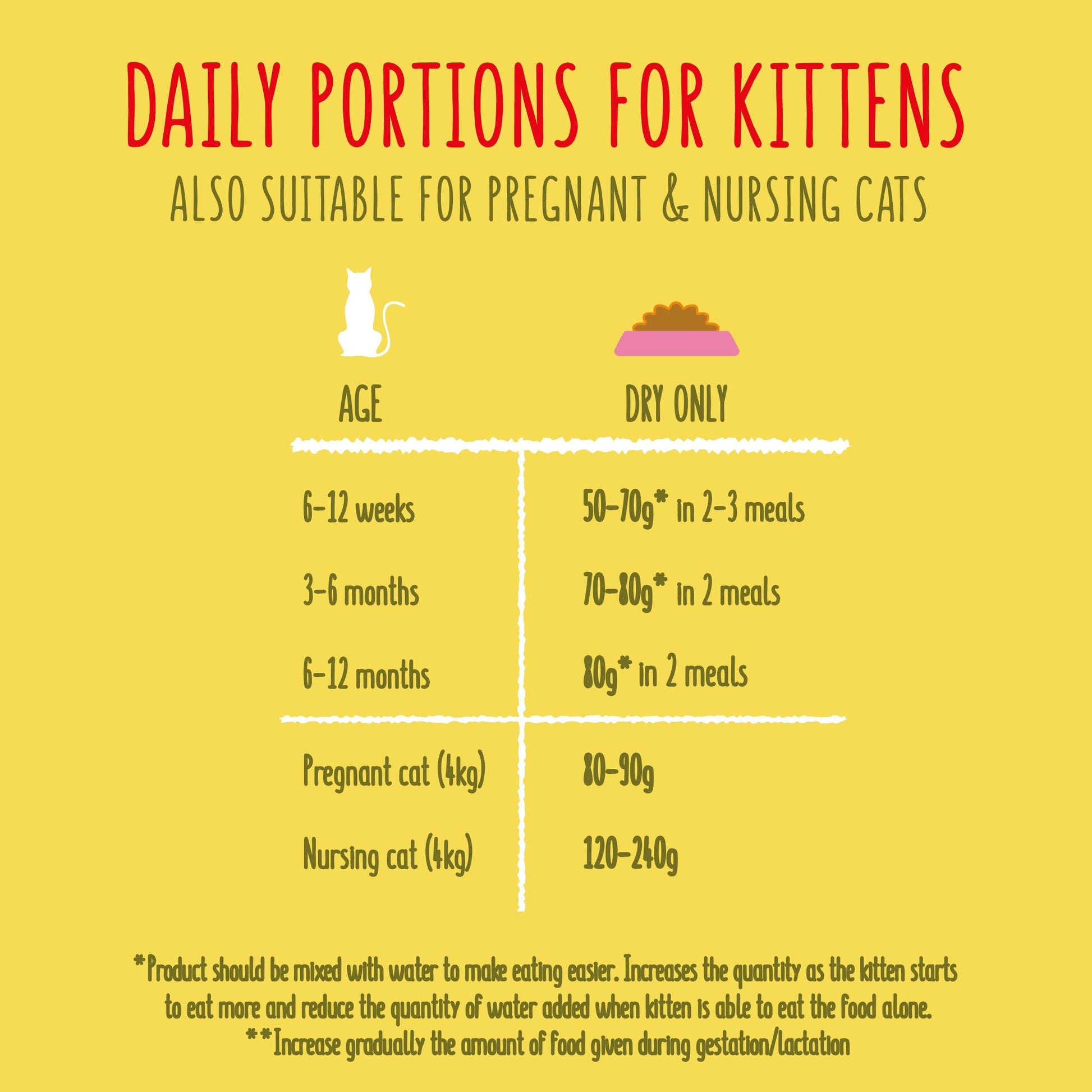 Daily feeding (g/day)Quantity of provide - (g/d) - Dry alone 6-12 weeks - 25 - 85g 2-3 meals* 3-6 months - 50 - 110g 2 meals* 6-12 months - 100g-60g 2 meals* Pregnant Cat - Min. 100* Nursing Cat - Min. 270**or ad libitum.