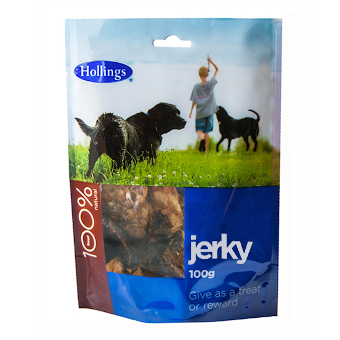 A delicious, super premium meaty treat for all adult dogs Hollings Jerky provides valuable nutrition made with simply 100% real beef of the finest quality to ensure optimal nutrition and a truly satisfying, chewy meaty treat.