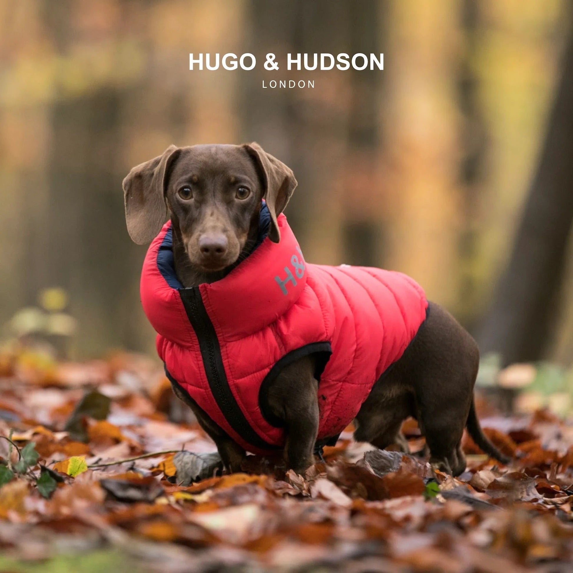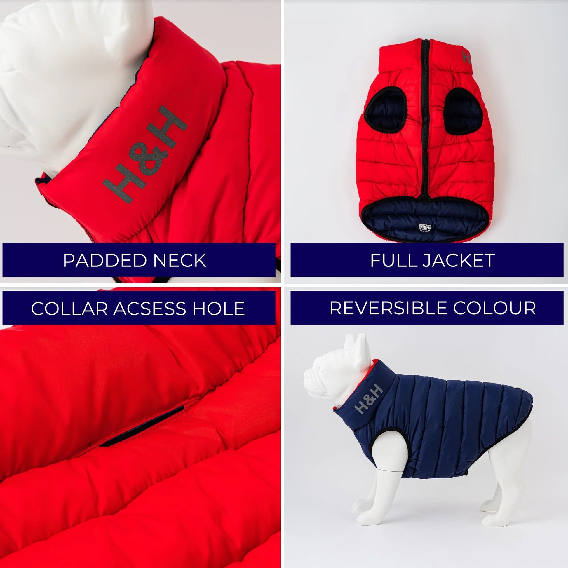 Introducing the reversible Hugo & Hudson Red and Navy Dog Puffer Jacket, designed to provide the ultimate comfort and protection for your pup in any weather. This jacket is crafted with high-quality materials and offers a range of features to ensure both style and functionality.
