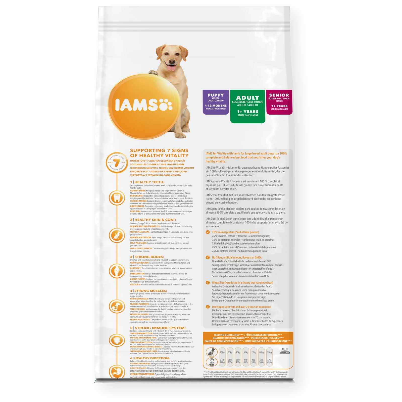 Introducing IAMS for Vitality, the ultimate nutrition for large-breed adult dogs. Our expertly crafted formula ensures your dog not only enjoys their meals but thrives on them. We've carefully selected high-quality animal protein, with a focus on lamb, to provide a complete and balanced diet that supports your dog's 7 signs of healthy vitality.