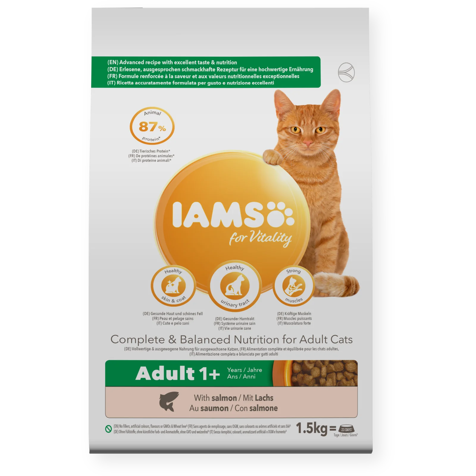 IAMS for Vitality for adult cats is a complete and balanced nutrition designed to support your cat's overall health and vitality. Our tasty adult recipe with salmon is formulated with high-quality animal protein, carefully selected to meet your cat's specific nutritional needs and to address the 7 signs of healthy vitality.