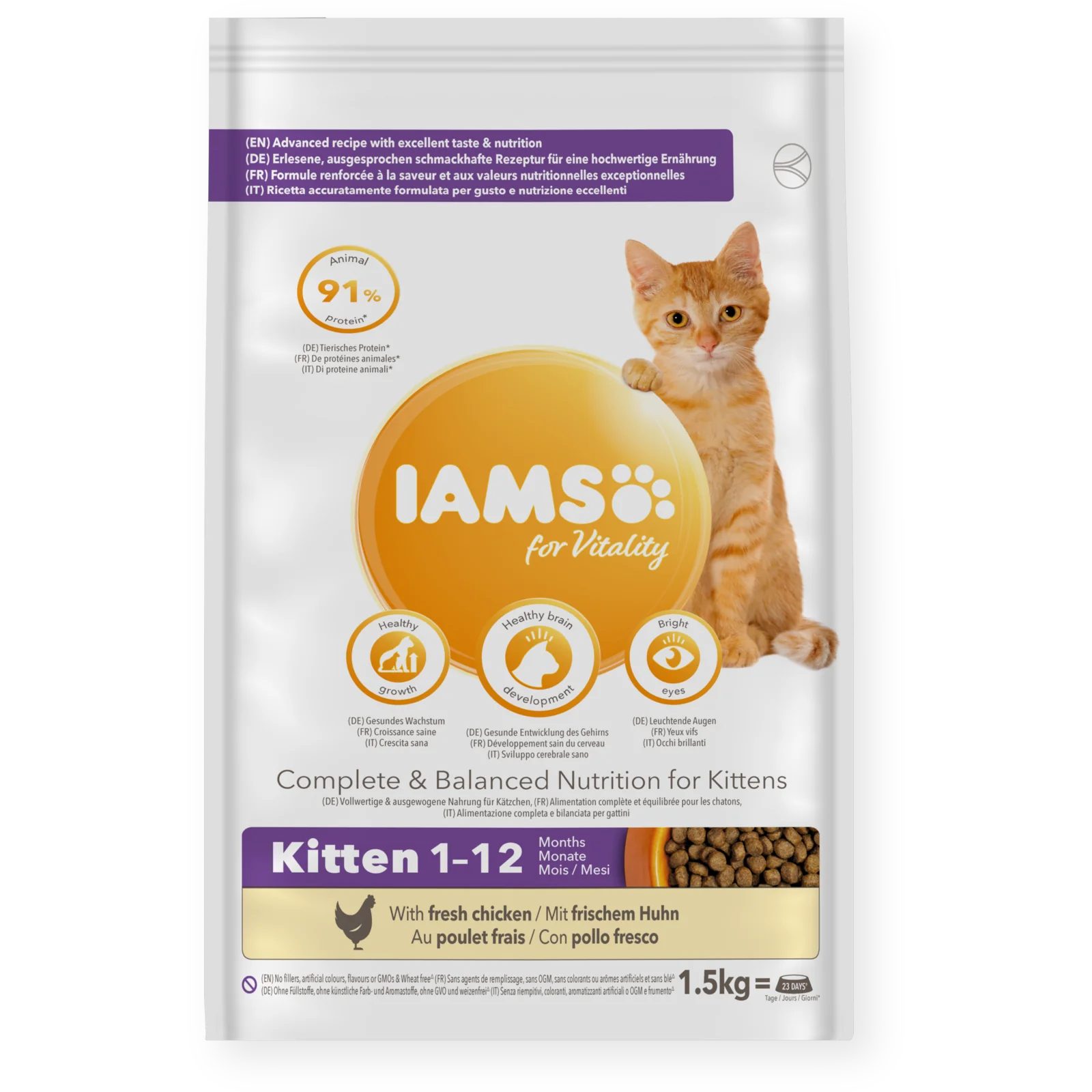 At IAMS, we believe that kittens should be healthy, active, and full of vitality. That's why our recipe contains 91% animal protein, providing the essential building blocks for your kitten's growth and development.