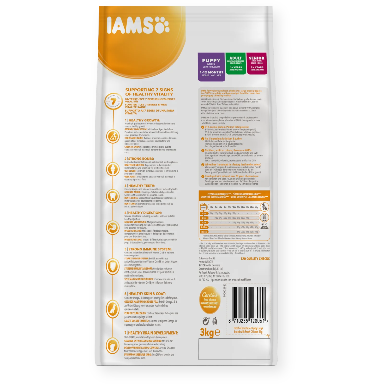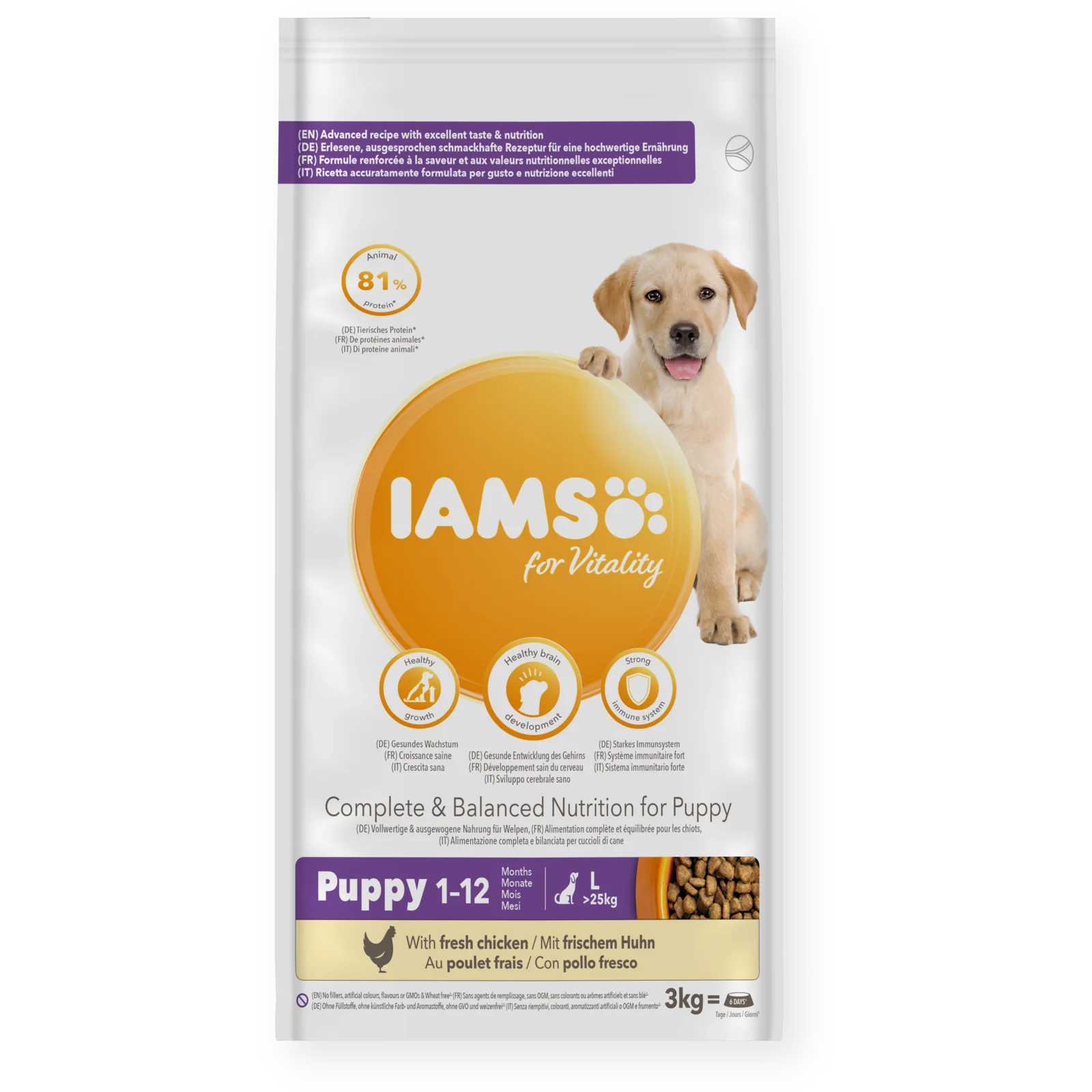 IAMS for Vitality for large breed puppies is a complete and balanced expert nutrition designed to support your puppy's healthy growth and vitality. Our tasty puppy recipe with fresh chicken is carefully formulated with high-quality animal protein to meet the specific needs of large breed puppies and promote their 7 signs of healthy vitality.