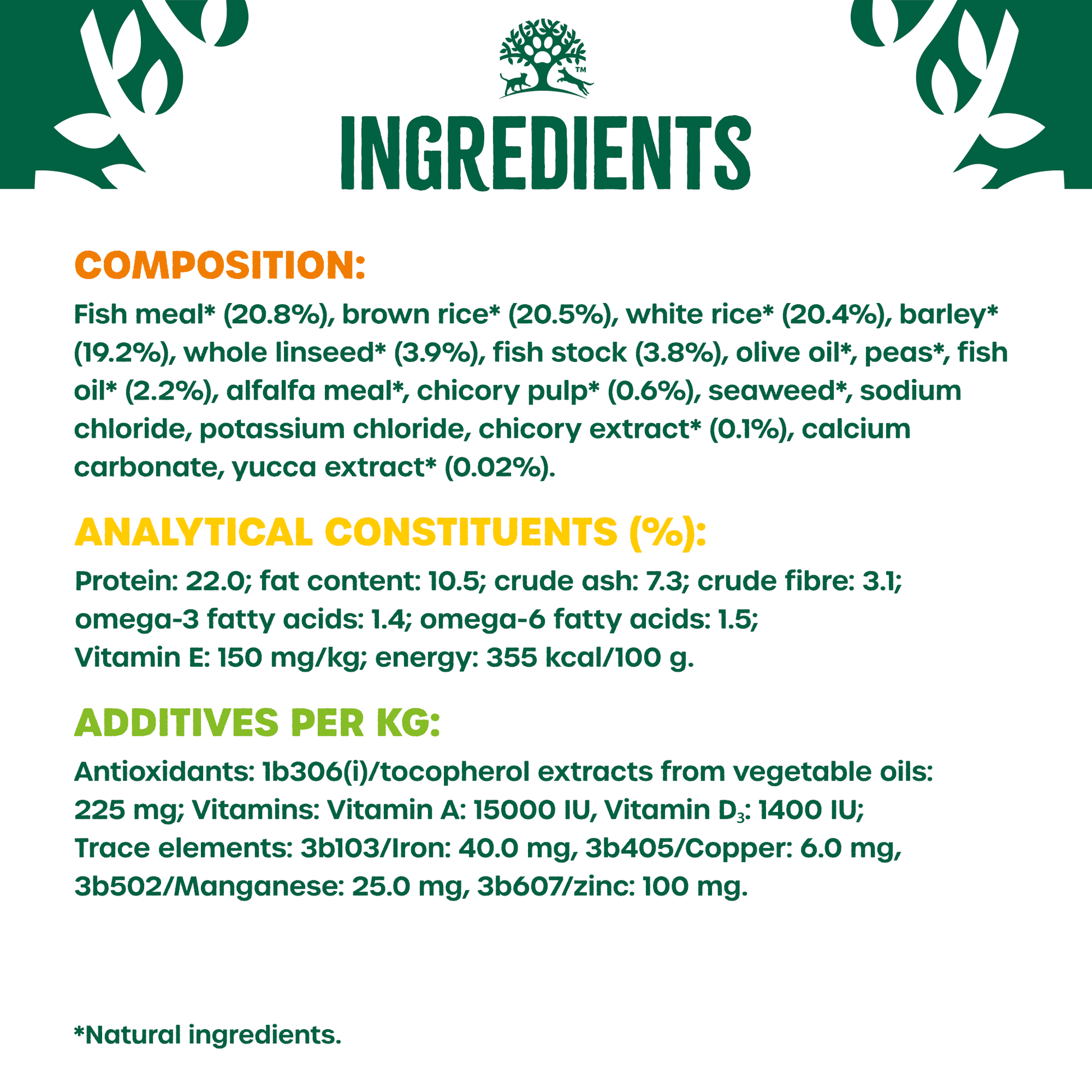 The recipe also includes rice, peas, and chicory, which contribute to the overall dietary fiber content and support healthy digestion. The addition of olive oil, linseed oil, and fish oil provides essential omega-3 fatty acids, promoting a healthy balance between omega-3 and omega-6 fatty acids in your dog's diet.