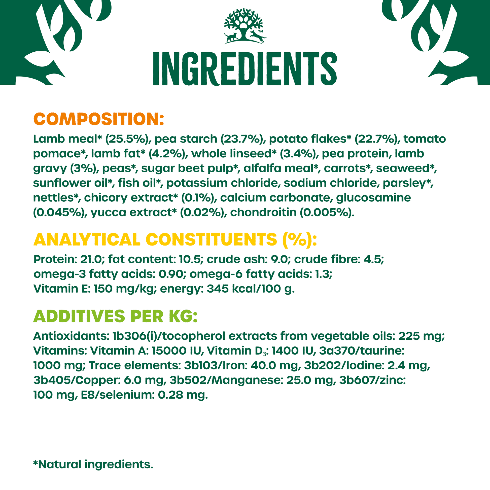 The main protein source in this recipe is lamb, which is known to be easily digestible for dogs. It provides essential amino acids and supports muscle development and maintenance. The carbohydrate sources used are peas and potatoes, which are slow-burning and provide sustained energy throughout the day.