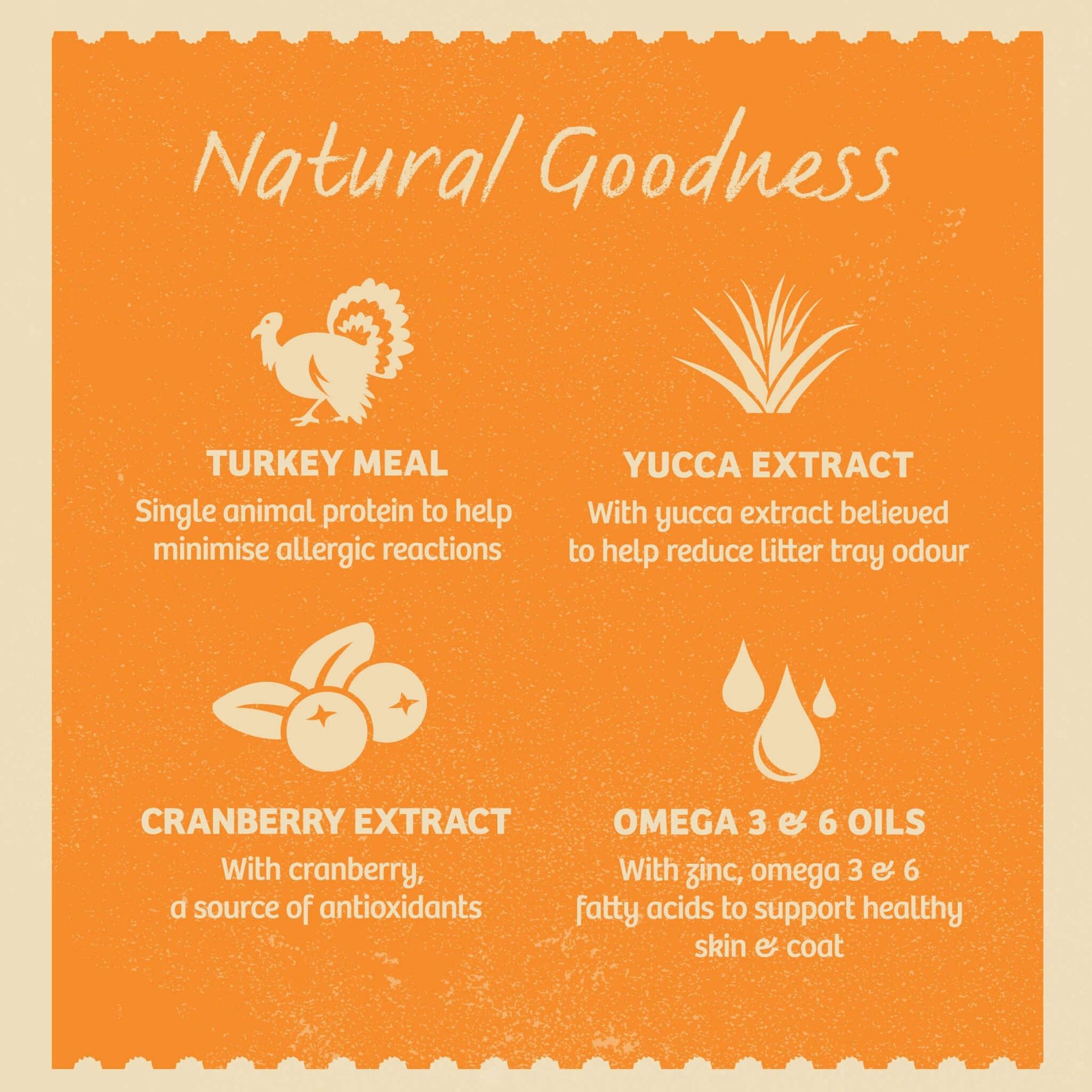 In each pouch, we carefully select a handful of ingredients from nature, including a single source of animal protein, which in this case is turkey. We believe in providing cats with the essential vitamins and minerals they need for overall well-being.