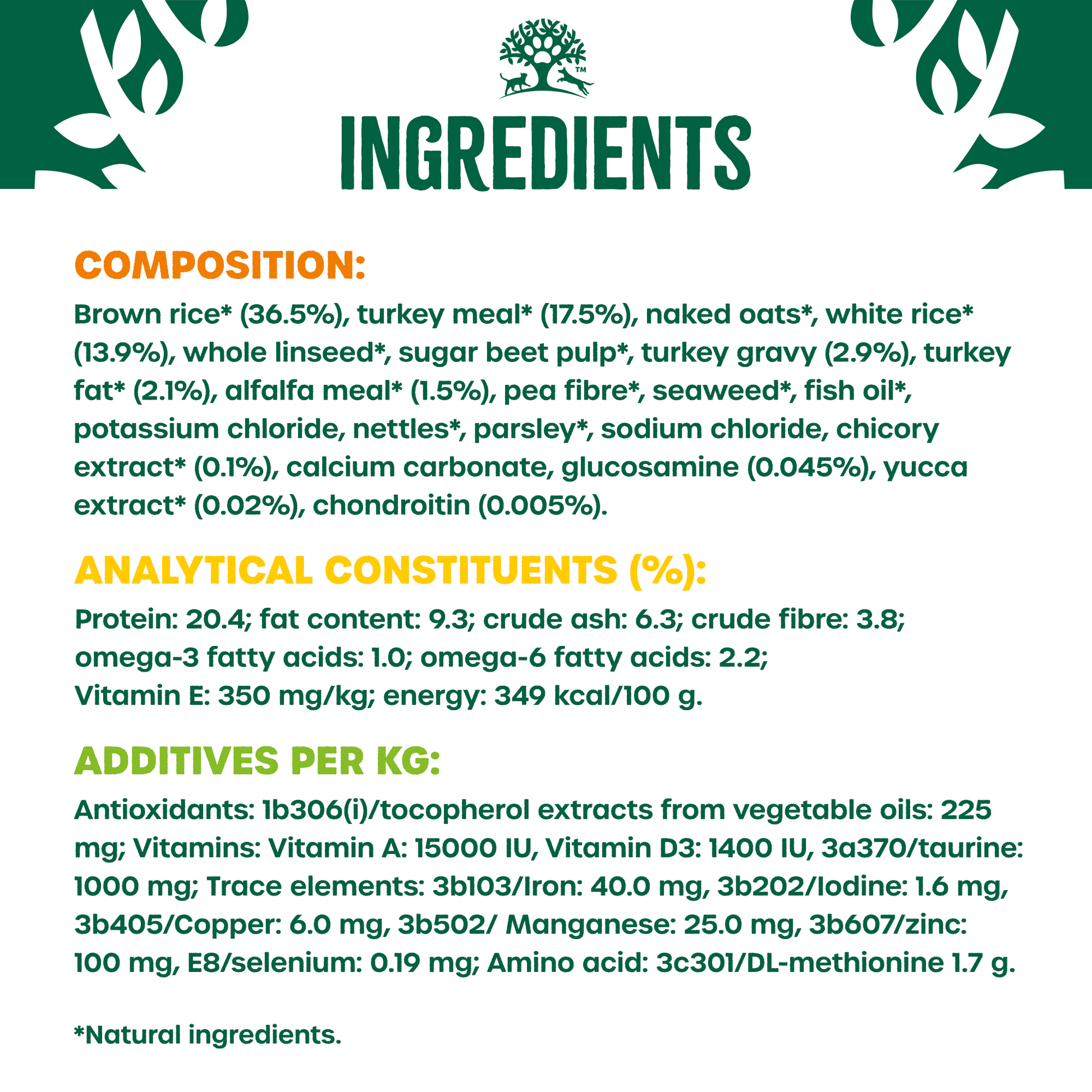 Turkey is a lean protein source that provides essential amino acids for maintaining muscle mass and supporting overall health in aging dogs. The inclusion of rice as a carbohydrate source provides energy and is gentle on the digestive system, making it easier for senior dogs to process and absorb nutrients.