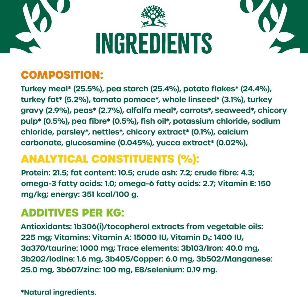 This recipe features turkey as the primary source of protein, which is highly digestible and provides essential amino acids for your dog's overall health and well-being. The carbohydrate sources in this food are peas and potatoes, which are easily digestible and help provide energy to support your dog's active lifestyle.