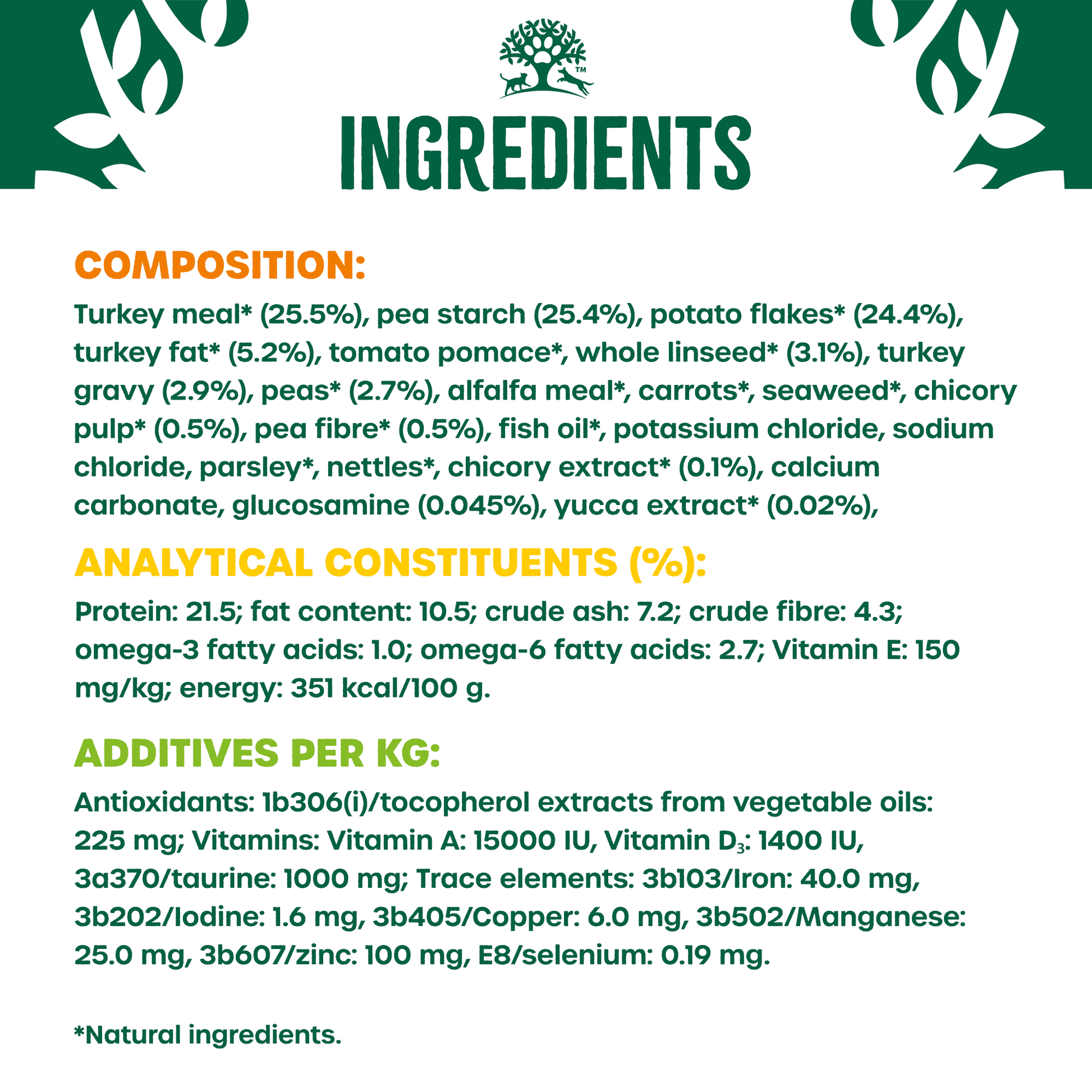 This recipe features turkey as the main protein source, which is easily digestible and provides essential amino acids for muscle maintenance and overall health. Peas and potatoes are included as slow-burning carbohydrates, providing energy while being gentle on the digestive system.