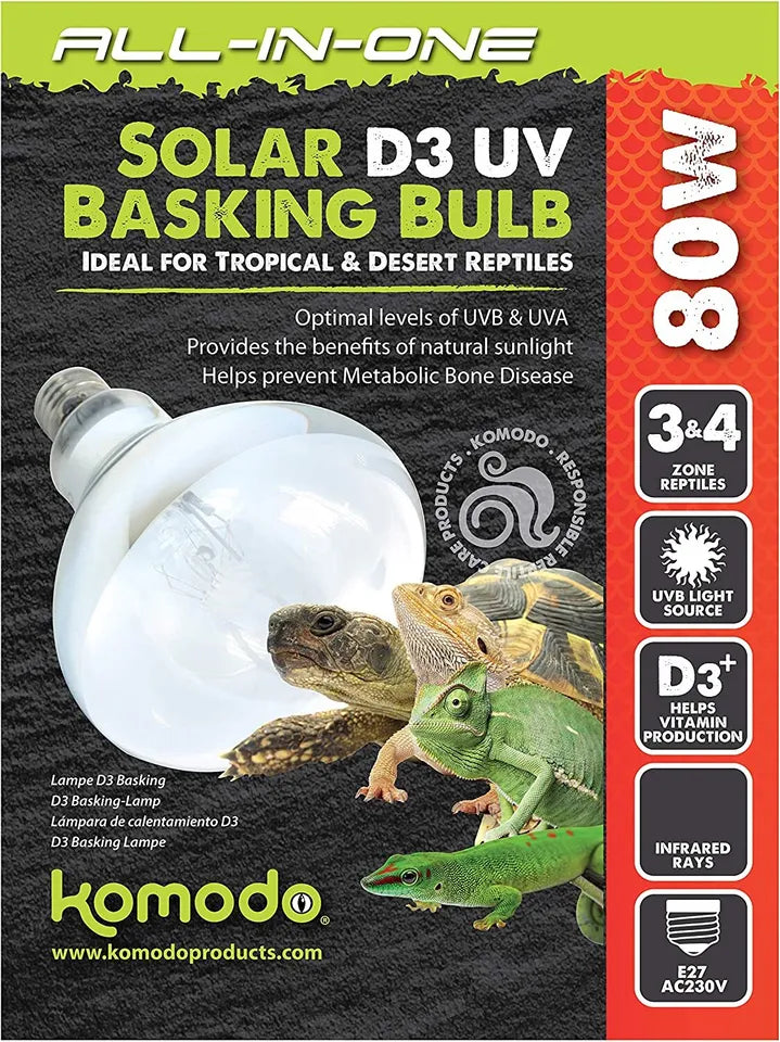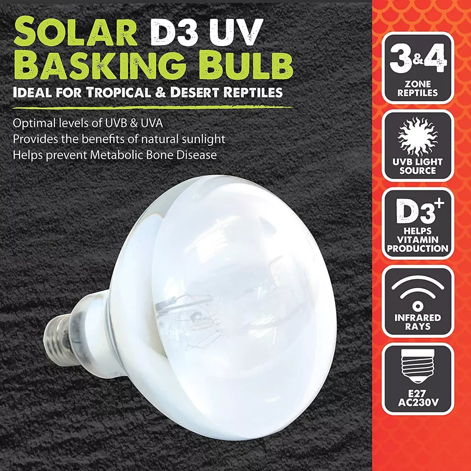 The Komodo Solar D3 UV Basking Bulb is a versatile all-in-one lighting solution that offers strong amounts of UVA, UVB, visible light, and heat through a single bulb. This makes it an excellent choice for reptiles that are open or partial sun baskers, as well as those that prefer mid-day sun.