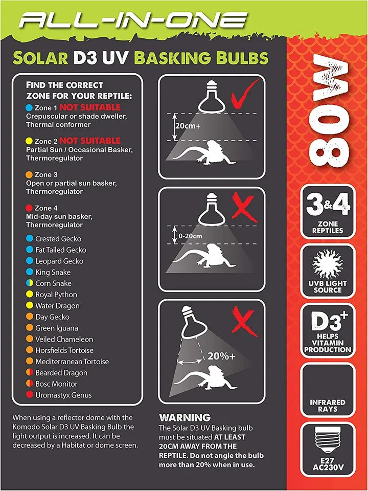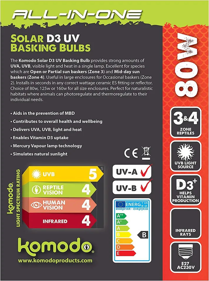 Key benefits of the Komodo Solar D3 UV Basking Bulb include: