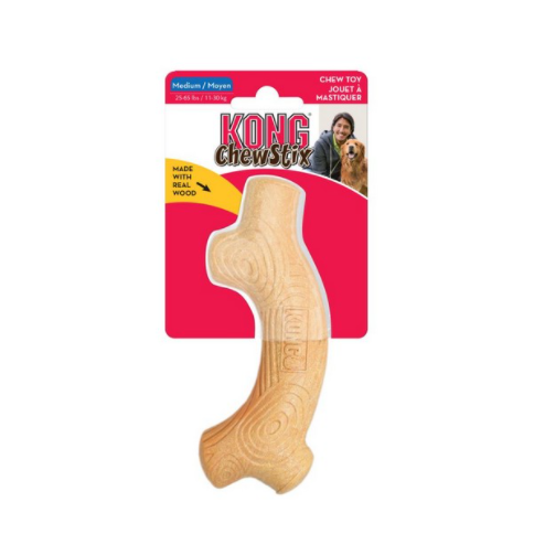 KONG ChewStix is a toy that contains real wood making it sure to delight those dogs that love to chase and chew sticks while providing a safer chewing solution. KONG ChewStixs also feature a bacon scent that entices and rewards appropriate chewing behavior. As dogs chew, the toy naturally flakes vs. splintering while being built for durability both combining to create chewing bliss that is built to last. Rounded edges and grooves continue the engagement while adding to the safety of the toy and helping clean teeth and gums.