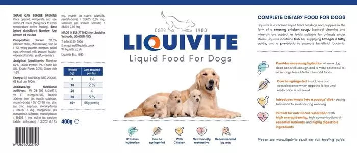 Ideal for dogs recuperating from surgery, during convalescence, or for rehydration purposes, its liquid consistency allows for easy feeding through a syringe if required. Additionally, Liquivite serves as a suitable option for weaning puppies over 4 weeks old, aiding in the introduction of meat without the challenge of solid portions that may be difficult to chew and digest.