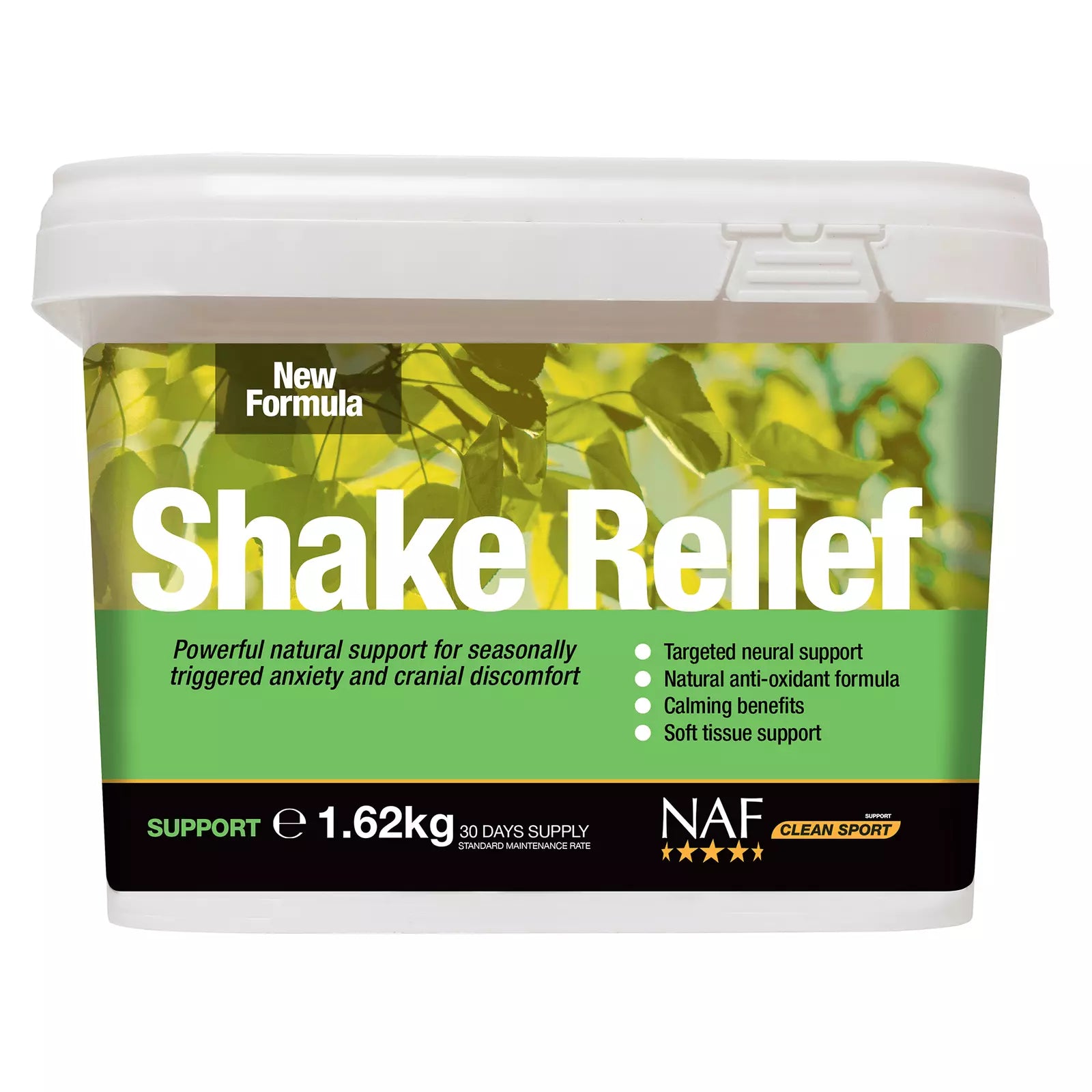 NAF Shake Relief Equine Supplements in a 1.62kg size are formulated to support horses experiencing seasonal skin irritations and discomfort. These supplements typically contain a blend of natural ingredients such as herbs, antioxidants, and omega fatty acids, which are aimed at promoting skin health and comfort.