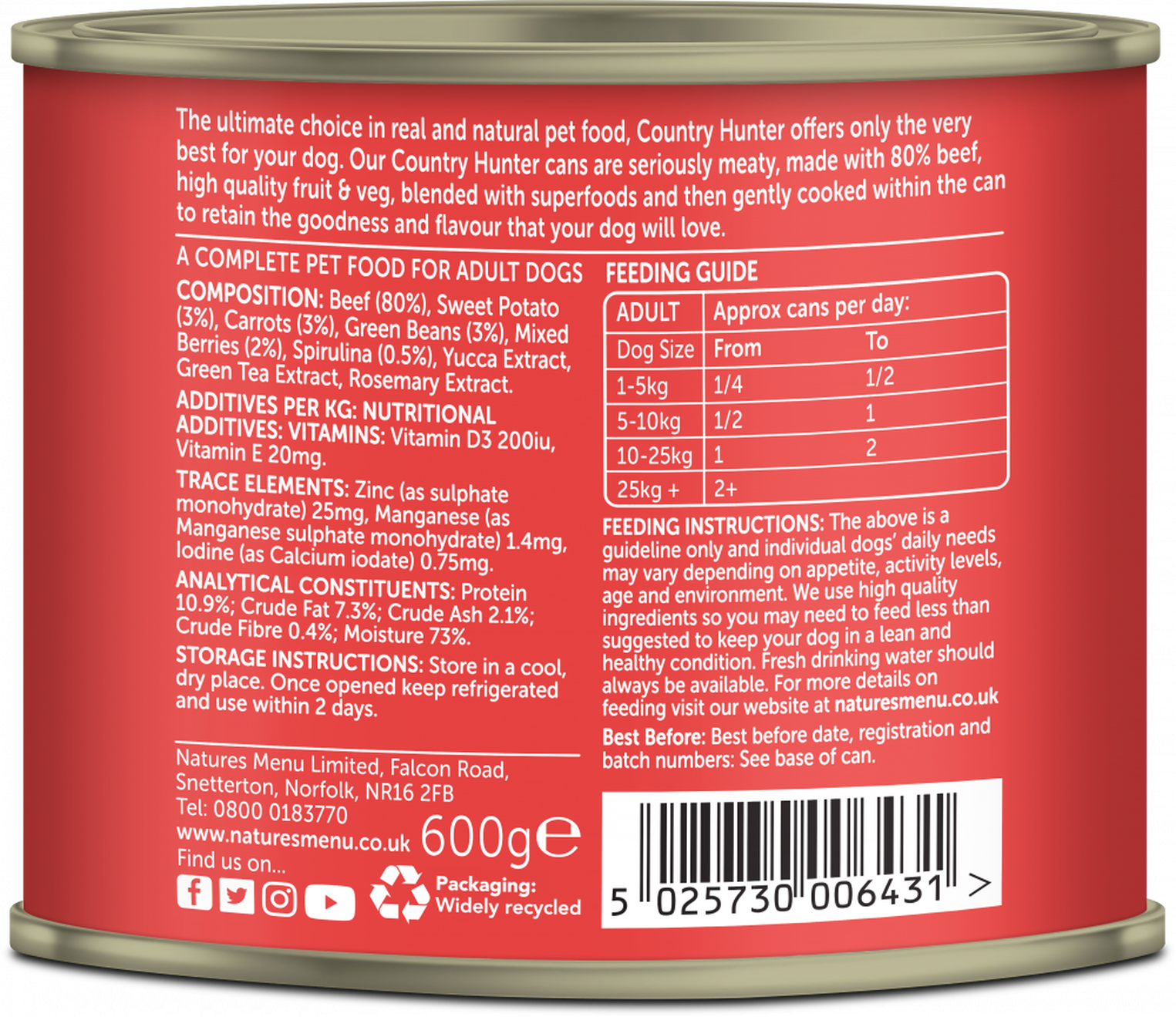 With a pack size of 600g, our beef dog food is convenient to portion and serve. Whether you have a small or large breed dog, our recipe is suitable for dogs of all sizes.