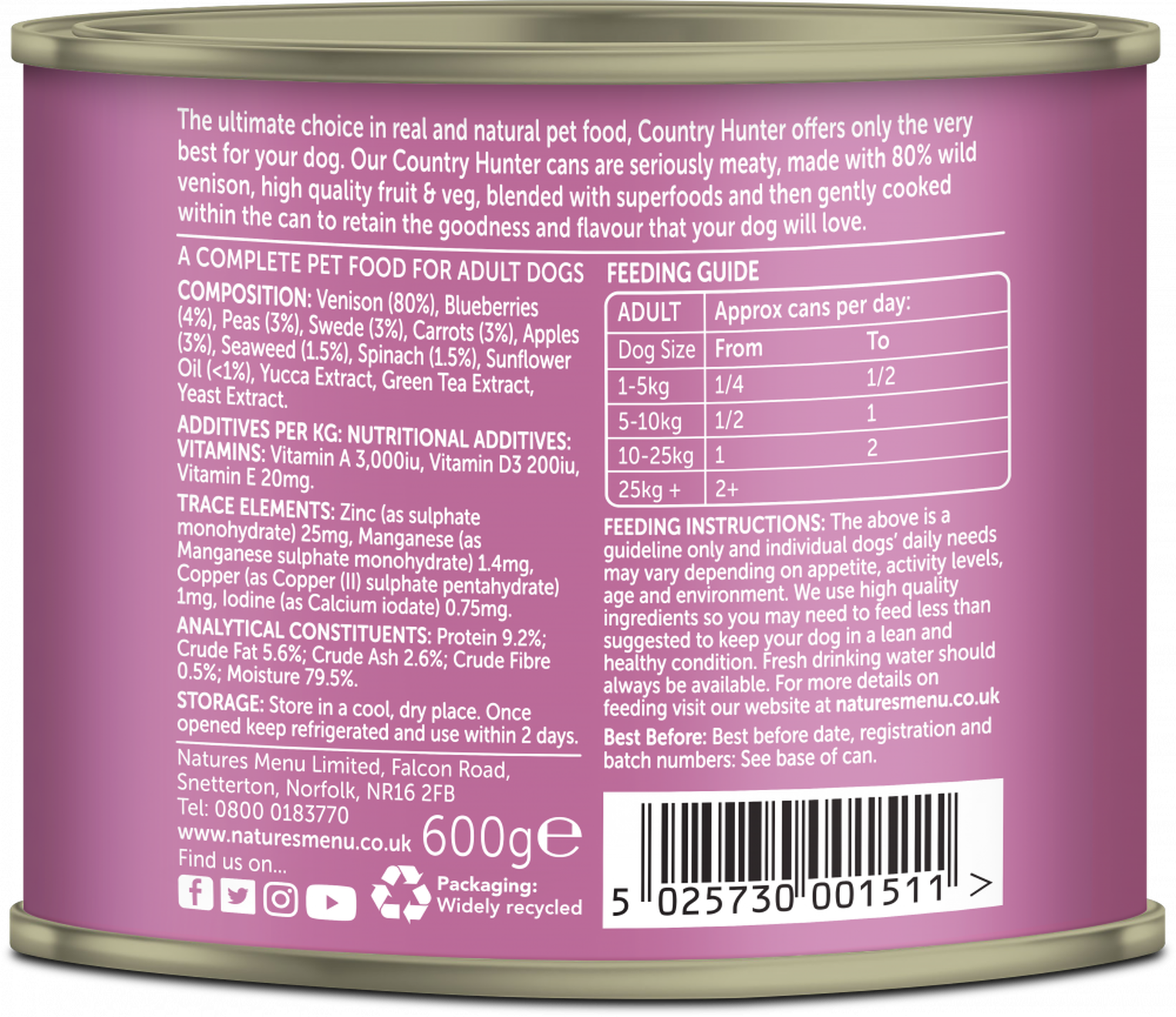 With a pack size of 600g, our wild venison dog food is convenient to portion and serve. Whether you have a small or large breed dog, our recipe is suitable for dogs of all sizes.