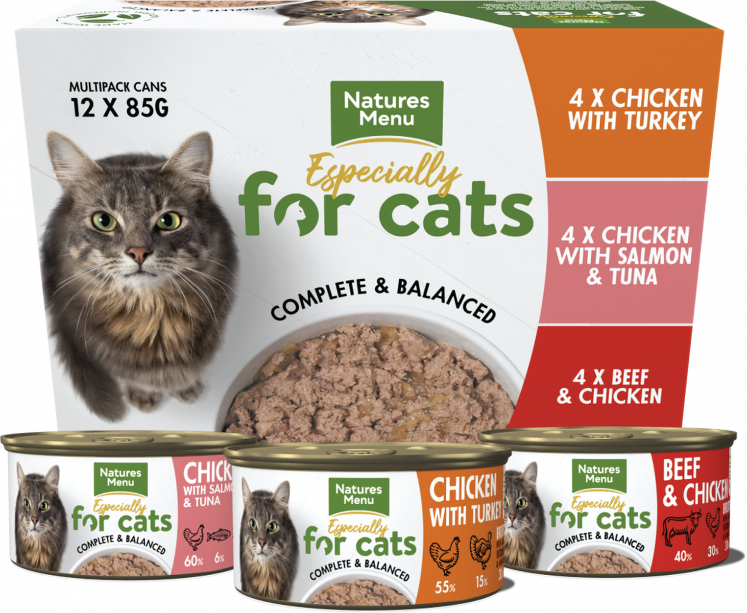 Our multipack Natures Menu Especially for Cats is designed to provide your cat with a variety of delicious and nutritious meals. Each canned cat food in the pack offers a different flavour combination to keep your cat's taste buds satisfied.