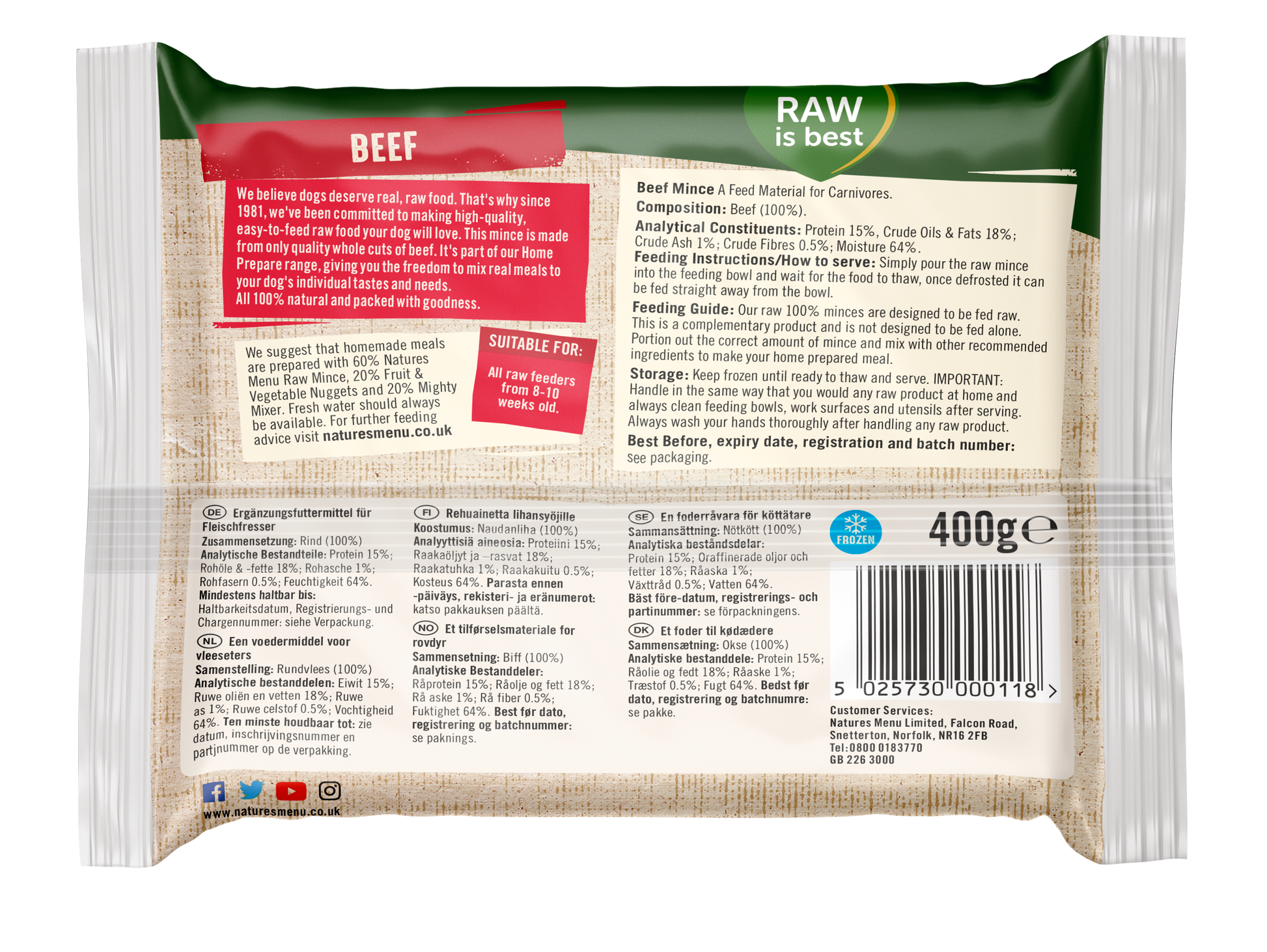 Just Beef Raw Mince is an ingredient or treat, not a complete meal. Add it to other ingredients to make balanced and nutritious raw meals at home.