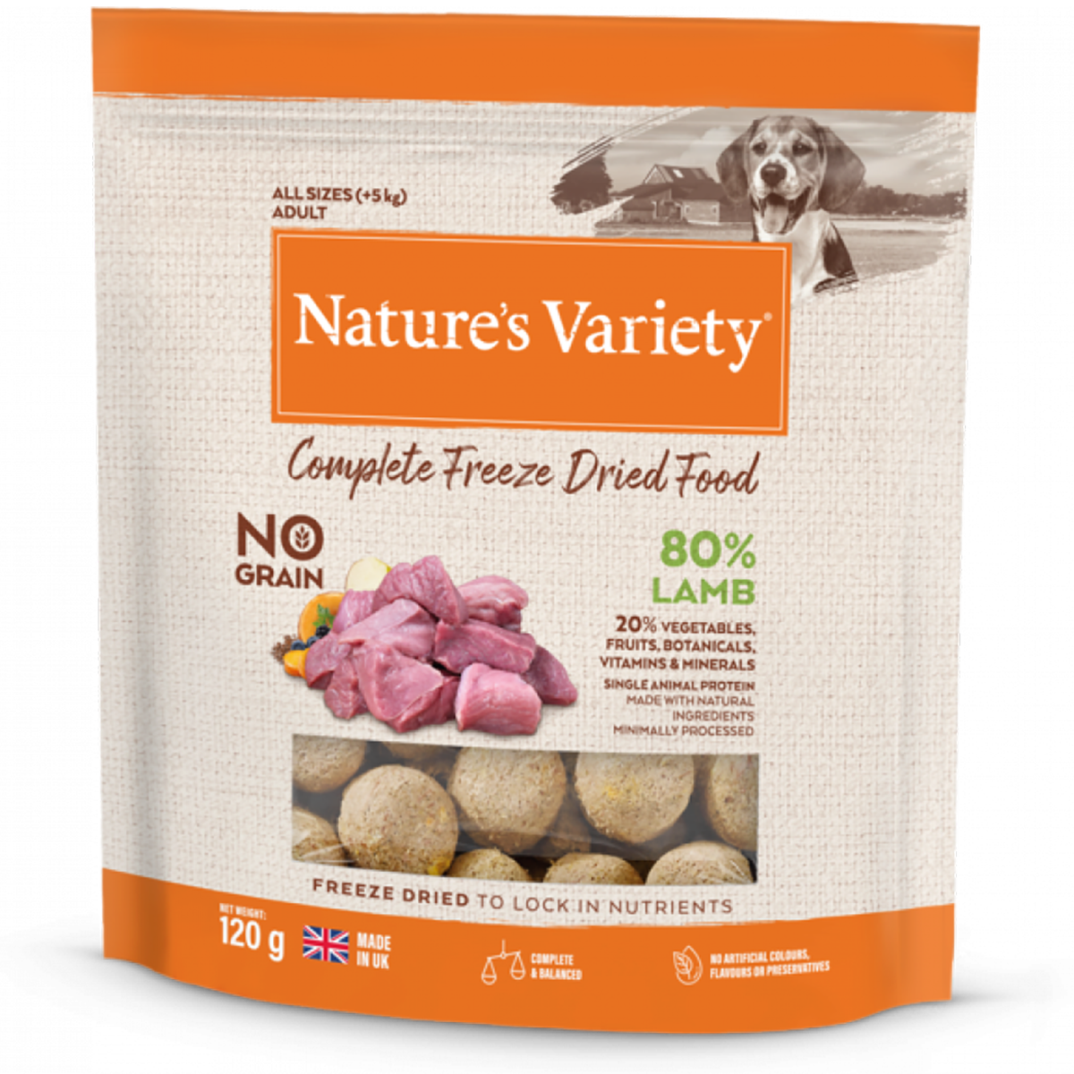 Nature's Variety Complete Freeze Dried Food is bite-size nuggets made with quality, deboned lamb as the main ingredient, blended with a special selection of superfood fruits, vegetables and botanicals. The nuggets are then freeze-dried.