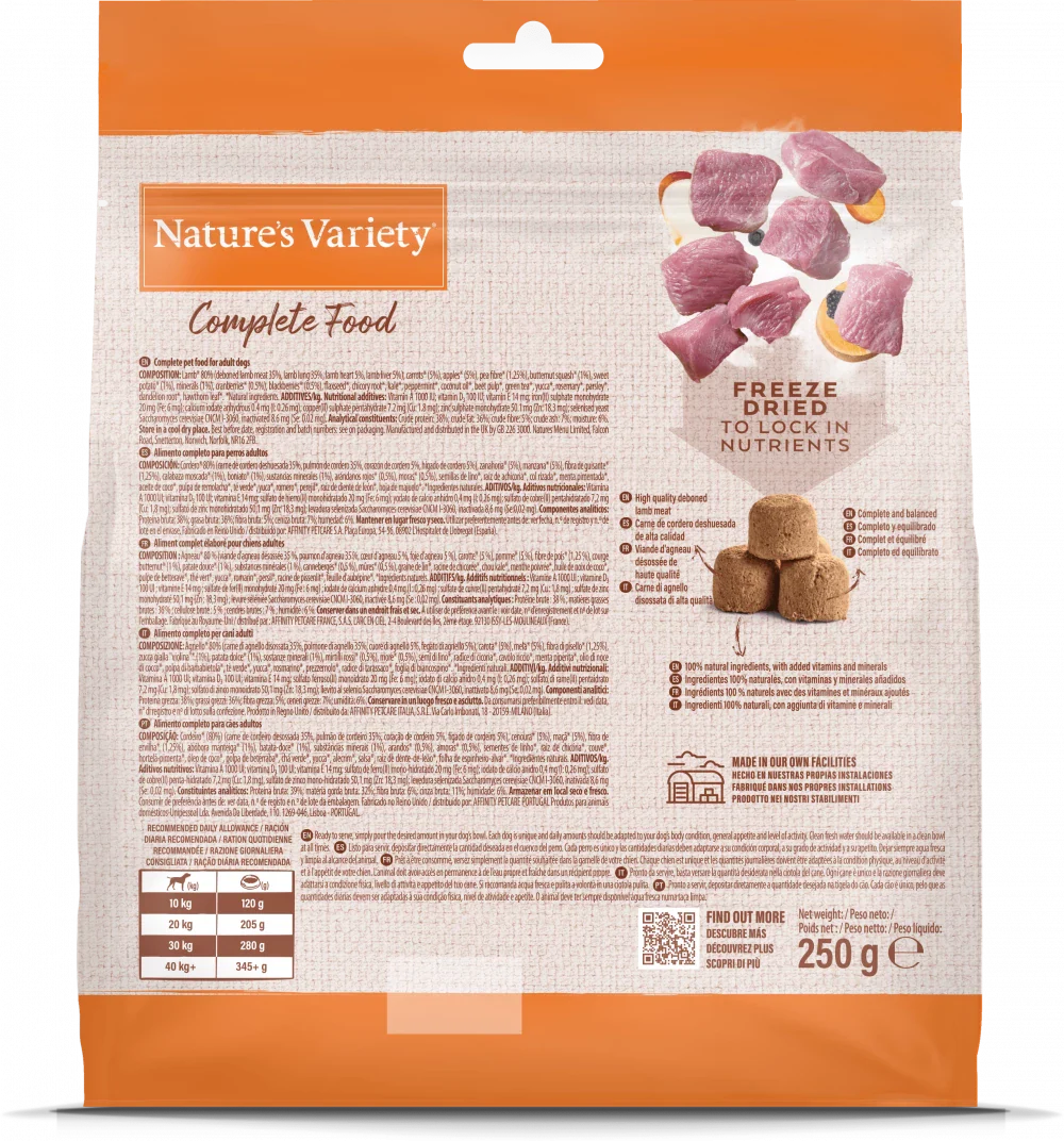 The main ingredient in Nature's Variety Complete Freeze Dried Food is quality, deboned lamb meat. It is blended with a special selection of powerfully nutritious fruits, vegetables, and botanicals. The raw ingredients are then formed into nuggets and freeze-dried.