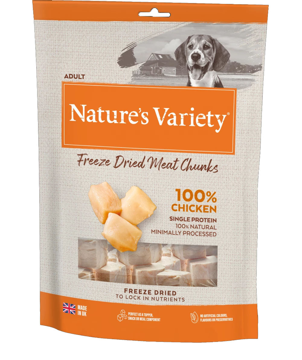 Nature's Variety Freeze Dried Chunks are a top-quality treat or meal topper made from 100% chicken chunks that have been freeze-dried to perfection. These chunks are not only packed with intense flavour but also contain all the nutritional goodness that only freeze-dried dog food can offer.