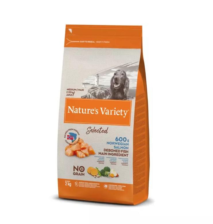 Nature's Variety Selected for medium and large-size dogs is a complete and balanced dry dog food with a difference. Its high-meat recipe features quality, deboned Norwegian Salmon as the main ingredient with a blend of wholesome fruit, vegetables and botanicals.