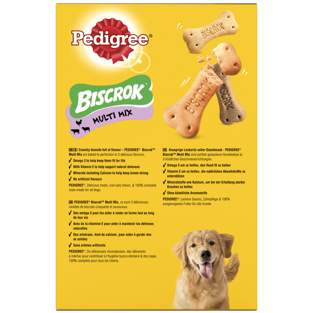 Dogs can't resist the satisfying crunch of PEDIGREE® BISCROK® Multi Mix, the ultimate crunchy dog treat biscuits packed with irresistible flavour. These treats are carefully baked to perfection in three mouthwatering varieties - Chicken, Beef, and Lamb flavours.
