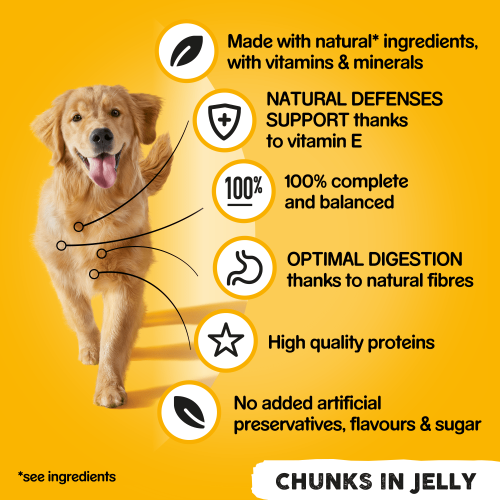 PEDIGREE® Chunks in Jelly offers 100% complete and balanced nutrition, carefully crafted with selected natural ingredients, vitamins, and minerals to provide everything essential for fueling your dog's exuberant love of life. Each pack contains 6 cans, featuring tempting flavors such as Beef & Carrots, Chicken & Carrots, and Lamb & Carrots, ensuring a variety to delight your dog's taste buds.