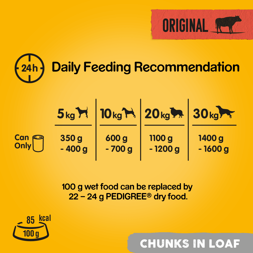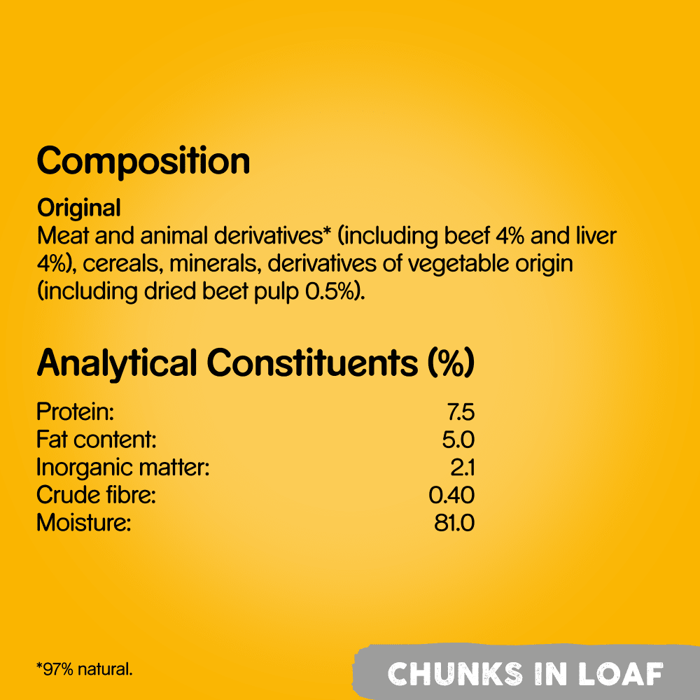 PEDIGREE® Original in Loaf, a 100% complete and balanced dog food made with carefully selected natural ingredients, plus essential vitamins and minerals, ensuring it fulfills all the dietary requirements needed to fuel your dog's exuberant love of life.